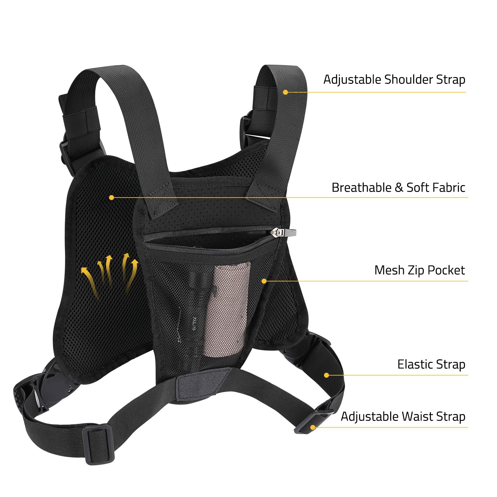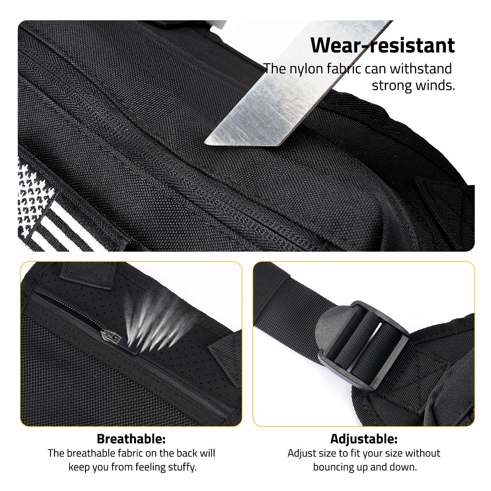 The nylon fabric is tear-resistant. The back of the chest bag for men is breathable. The zipped pockets on both the front and back allow for easy storage of items.