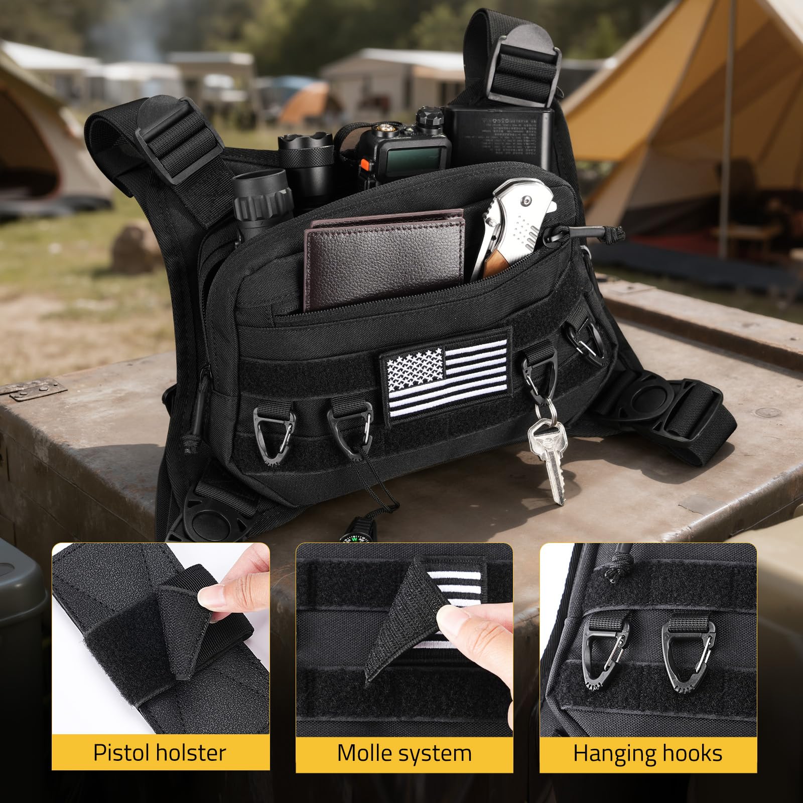 Large Capacity and Molle Design:Our chest bag for men features large-capacity pockets.The front pocket has molle straps and four clip points, allowing for hanging small items