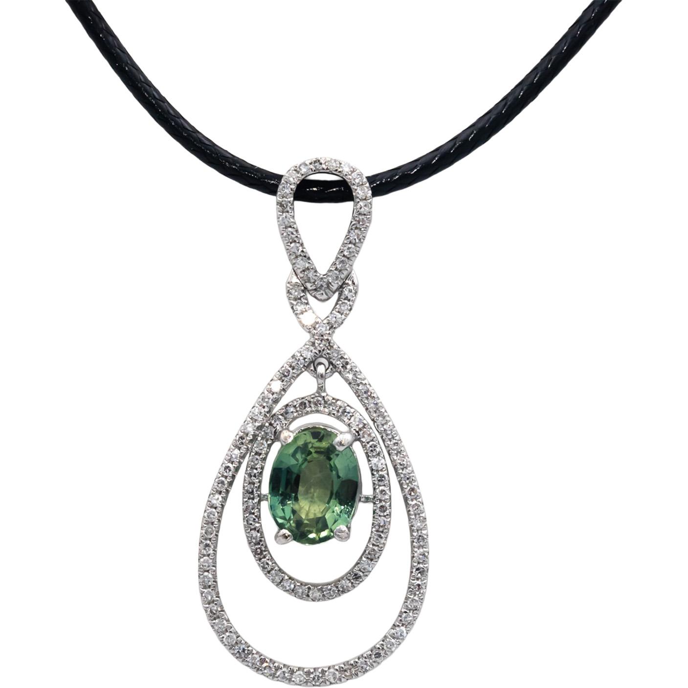 Crafted in 18k white gold, this piece showcases an elegant teardrop design. The pendant features a central oval-cut green sapphire, weighing 1.34 carats (treated), encircled by a halo of round-cut white diamonds totaling 0.5 carats (VS2 - SI1 clarity/G - H color). The intricate arrangement of the stones creates a captivating interplay of colors and brilliance.