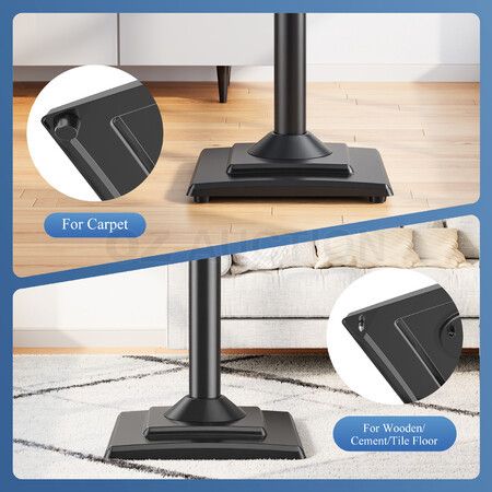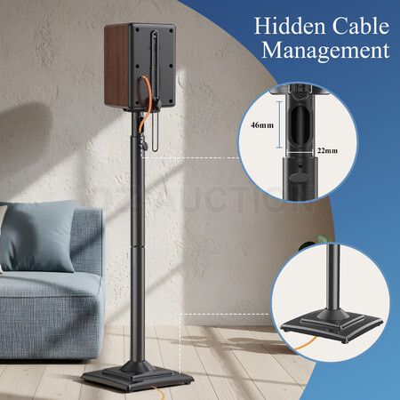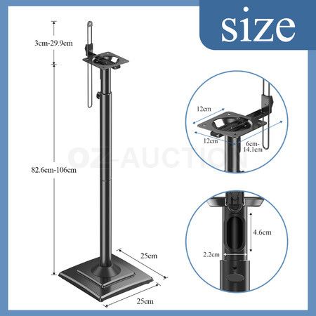 Upgrade your audio setup for richer, more immersive surround sound with this pair of Floor Rear Speaker Stands for Surround Sound Bookshelf Satellite Speakers. Forget complicated setups—these speaker stands feature tool-free height adjustment from 82.6 cm to 106 cm. Therefore, you can perfectly position your speakers at ear level, whether you're settled on the couch for a movie night or moving around the room to your favourite album, ensuring crystal-clear, direct sound every time. Loading speakers up to 5 kg, these loudspeaker stands offer three universal mounting options, including L-brackets, top plates, and locking hole adaptors, to fit speakers with mounting holes up to 29.9 cm high. Each stand is built on a solid, stable foundation with a wide 25x25 cm base and contains both fixed and adjustable feet to prevent wobbling, bumps or tipping. The integrated cable management channels (2.2x4.6 cm) keep your space clean and tidy. This pair of rear surround speaker stands is a must-have for achieving a neat setup and studio-quality sound at home.