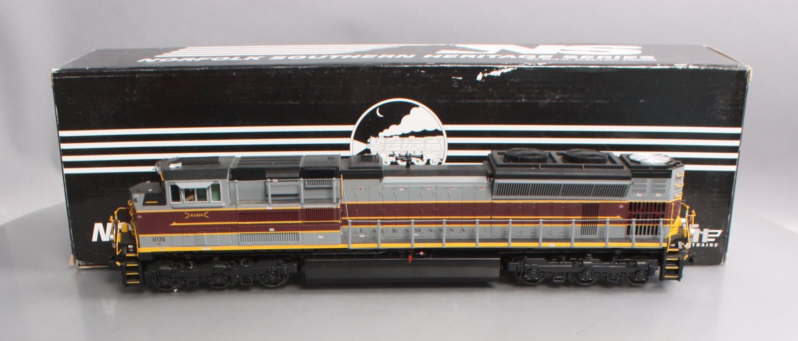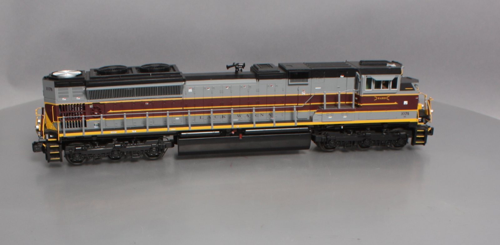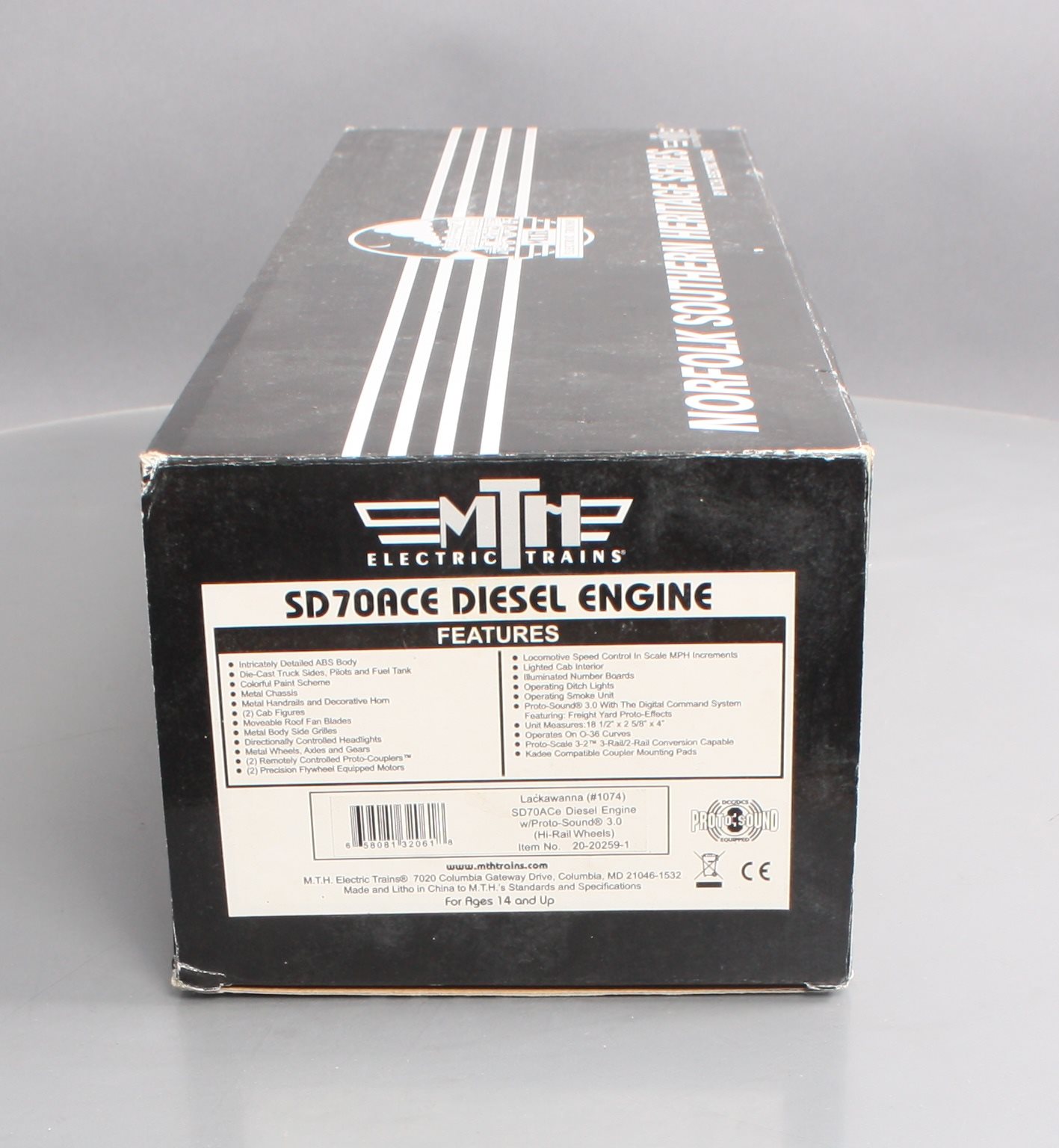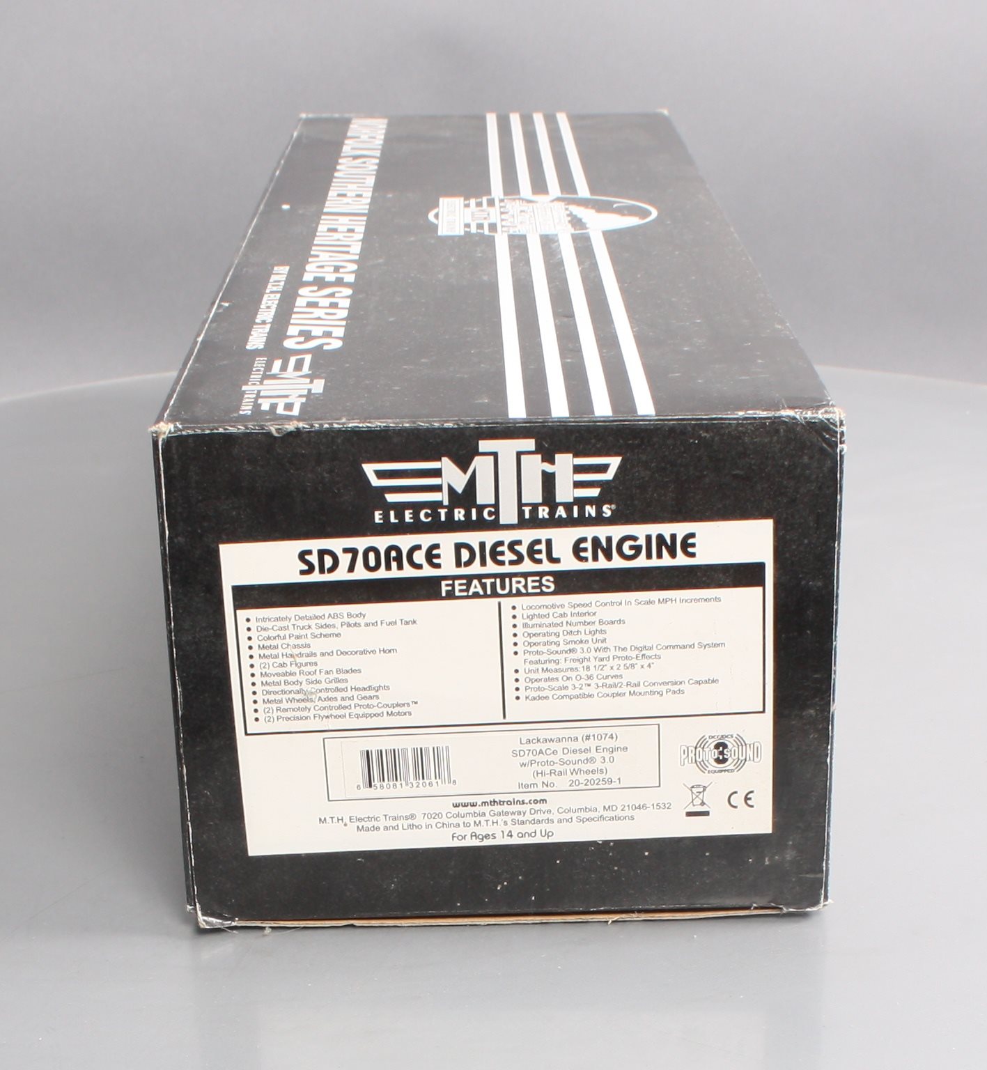 Here is a 20-20259-1 Lackawanna SD70ACe Diesel Engine with P-S 3.0 and Hi-Rail Wheels from MTH. Features include: Intricately Detailed ABS Body, Die-Cast Truck Sides, Colorful Paint Scheme, Metal Chassis, Metal Handrails and Decorative Horn, (2) Cab Figures, Moveable Roof Fan Blades, Metal Body Side Grilles, Directionally Controlled Headlights, Metal Wheels, Axles and Gears (2) Precision Flywheel Equipped Motors, Locomotive Speed Control In Scale MPH Increments, Lighted Cab Interior, Illuminated Number Boards, Lighted Marker Lights, Operating Ditch Lights, Operating Smoke Unit, Proto-Scale 3-2 3-Rail/2-Rail Conversion, and Capable Kadee Compatible Coupler Mounting Pads. This unit is equipped with Proto-Sound 3.0 With The Digital Command System Featuring: Freight Yard Proto-Effects. This Unit Measures:18 1/2 x 2 5/8 x 4 and it operates On O-42 Curves