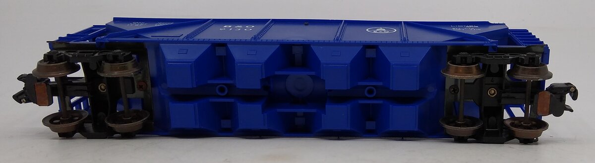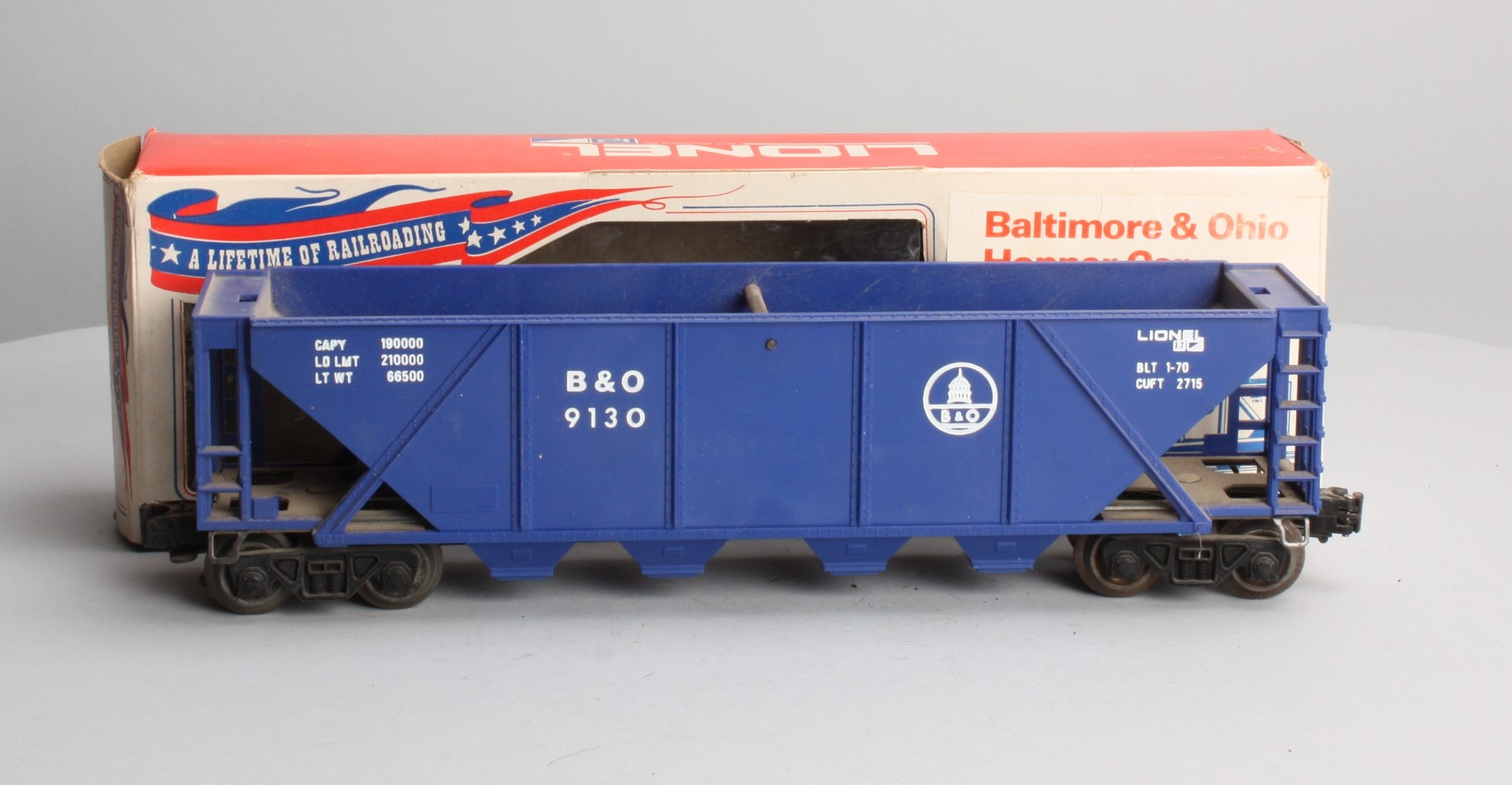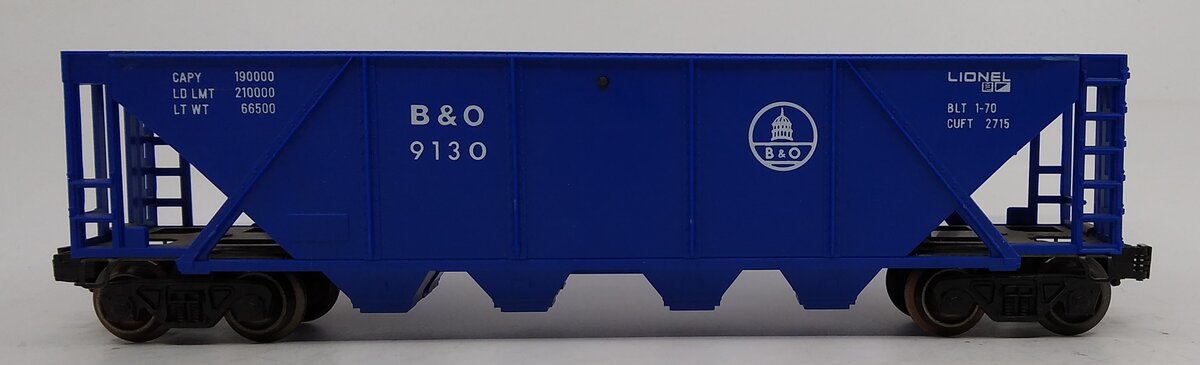 Here is a Lionel 6-9130 O Gauge Baltimore and Ohio 4-Bay Hopper. This hopper features durable plastic construction, plastic trucks, operating knuckle couplers, metal wheels and axles.