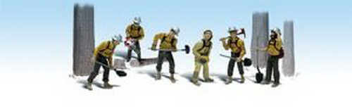 Six firefighters wearing backpacks with tools in hands are ready to fight the flames.