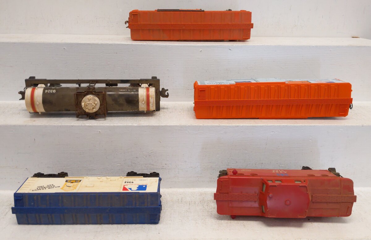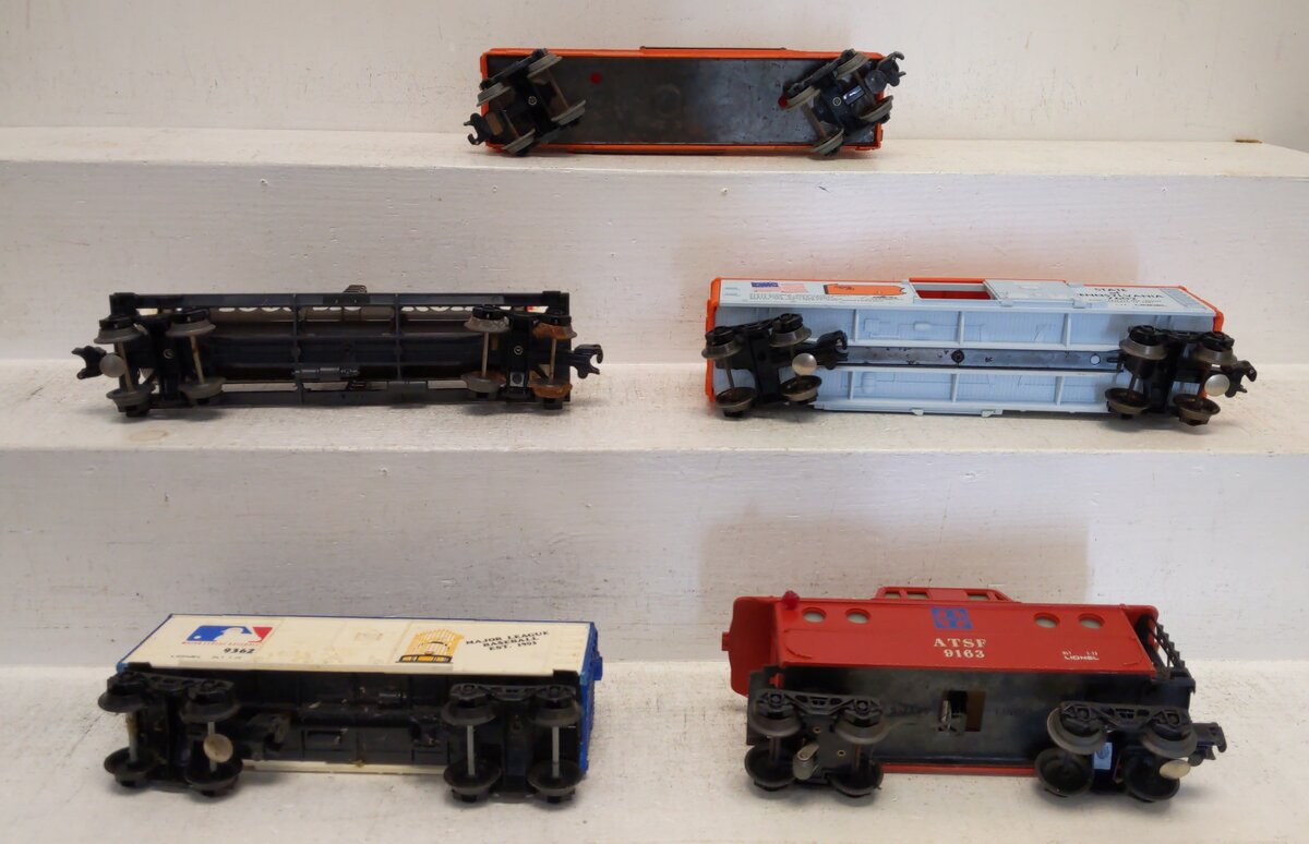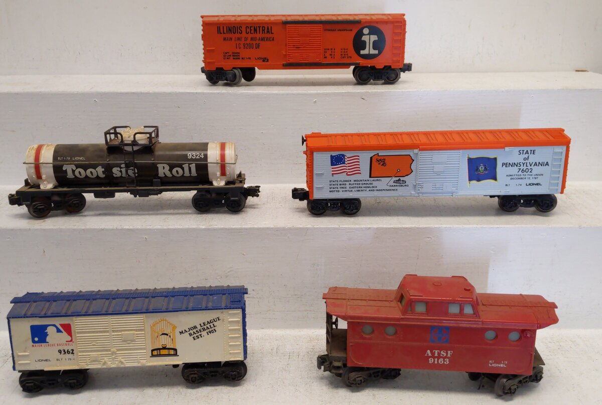 Here are 5 Lionel O MPC Freight Cars: 9163, 9362, 7602, 9324, 9200 [5]. All items feature plastic body construction, plastic trucks, both fixed or operating knuckle couplers, and metal wheels and axles. Caboose features lighting.