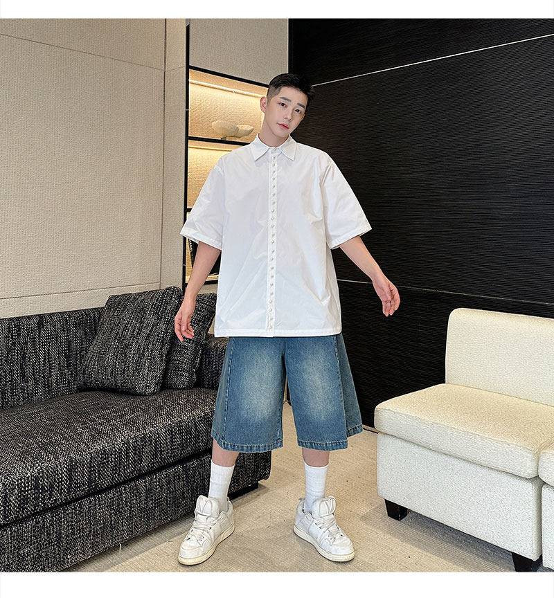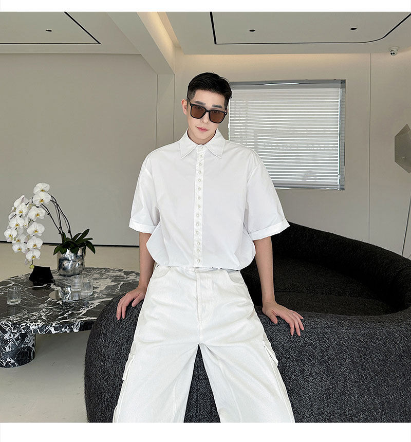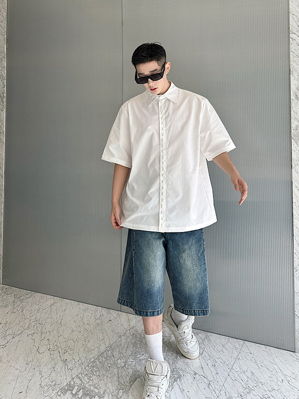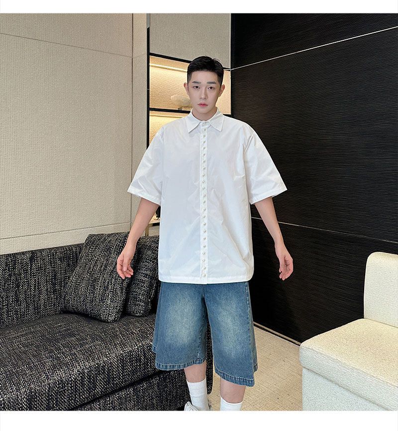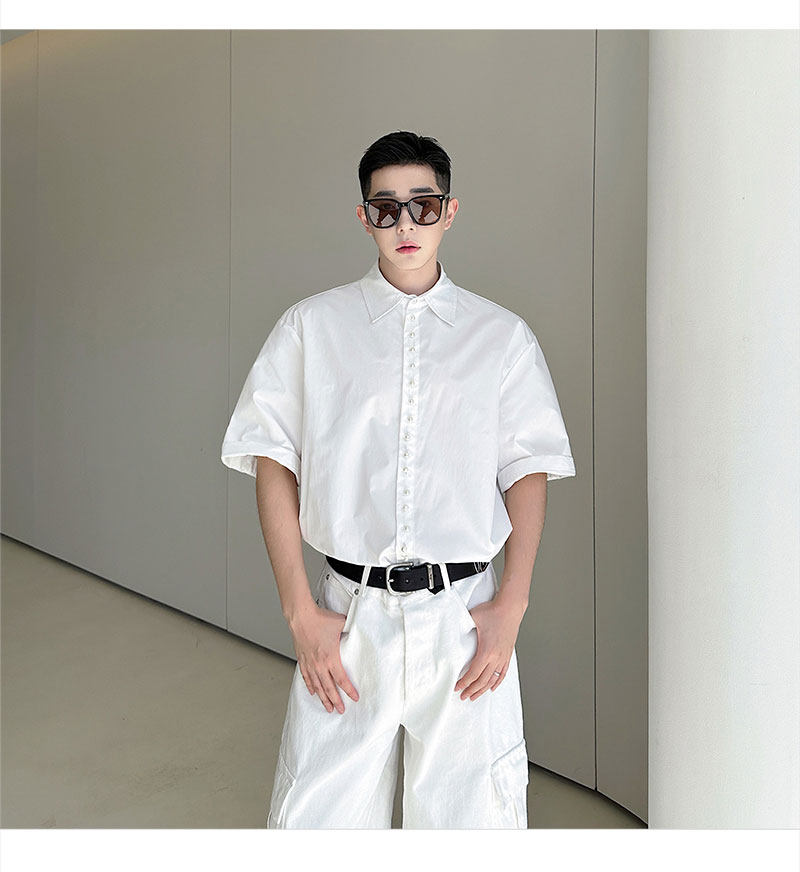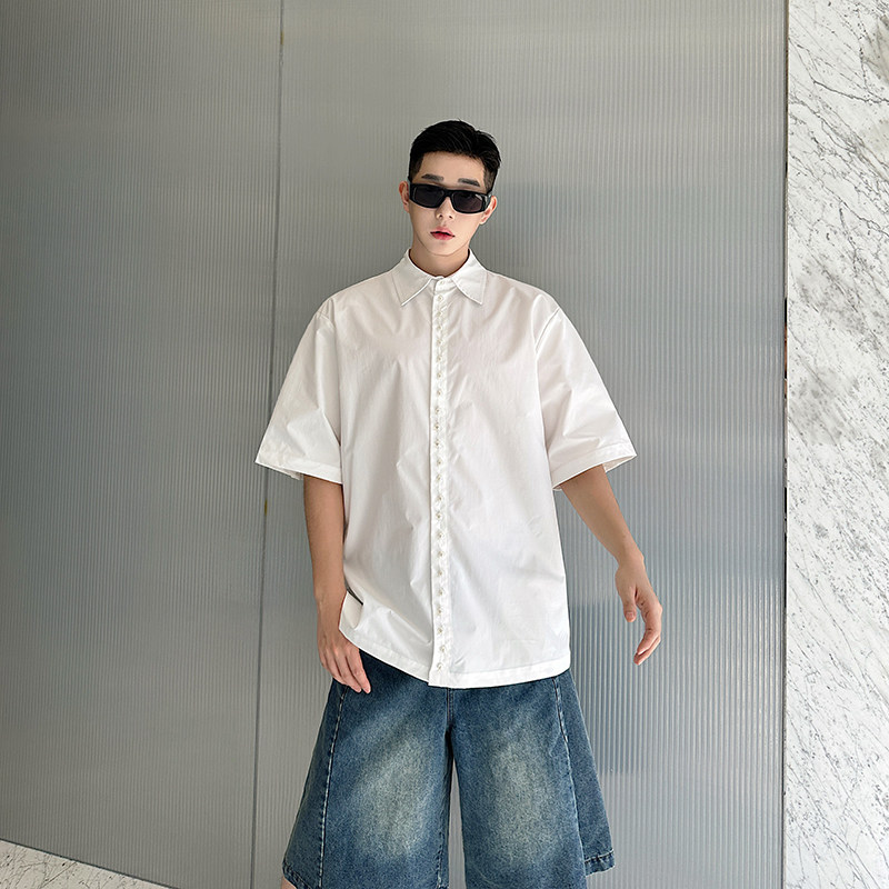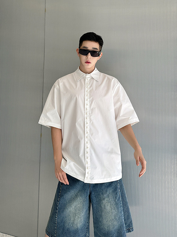 2025 Summer White Lapel Shirt Men's Short-sleeved Hand-beaded Fashionable Casual