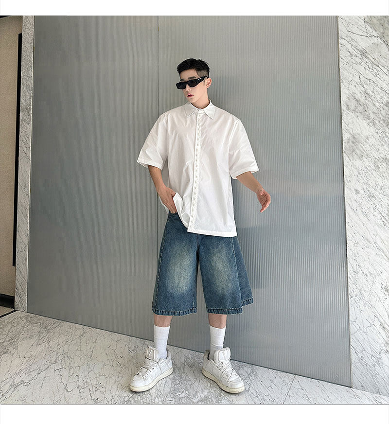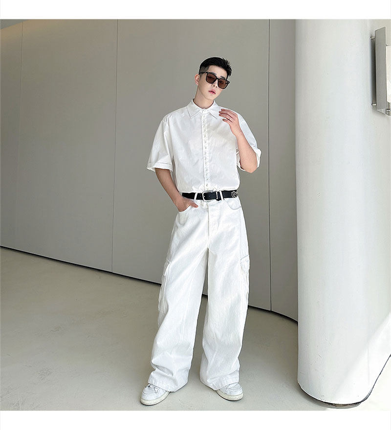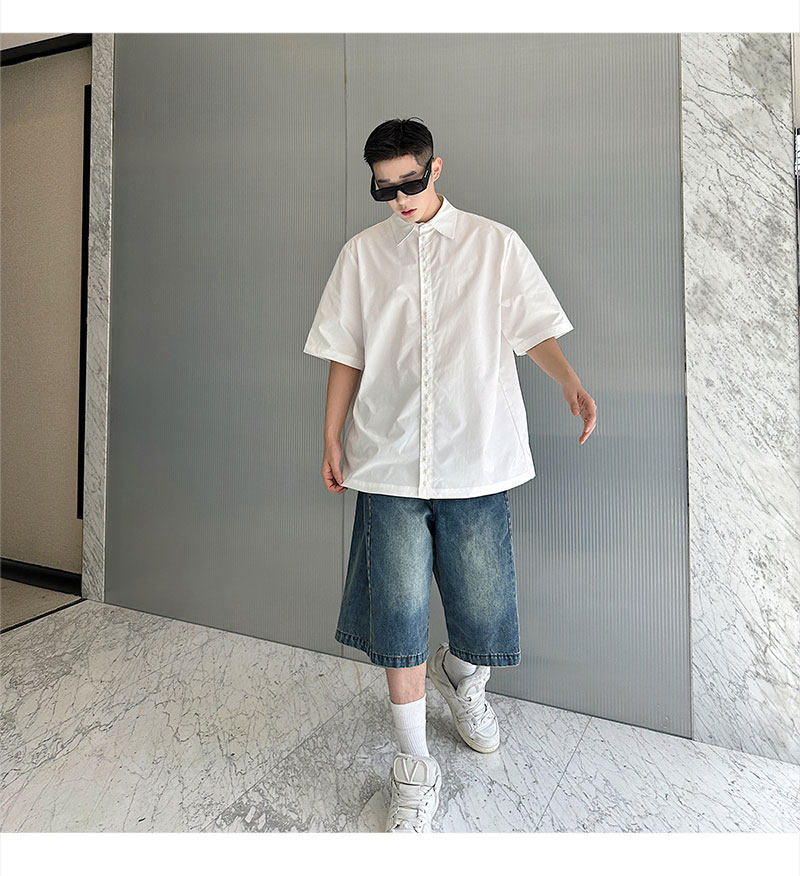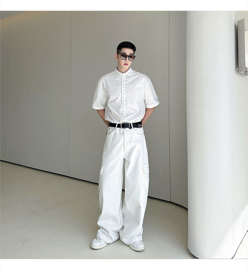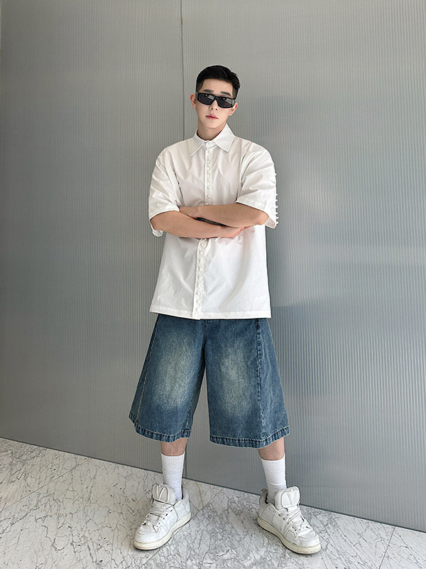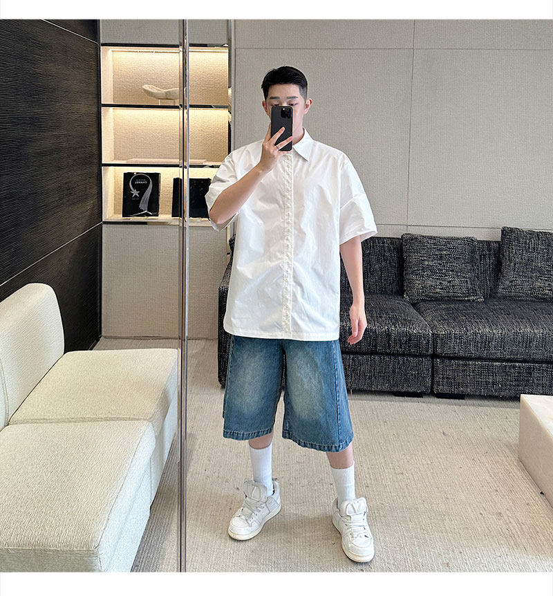 2025 Summer White Lapel Shirt Men's Short-sleeved Hand-beaded Fashionable Casual