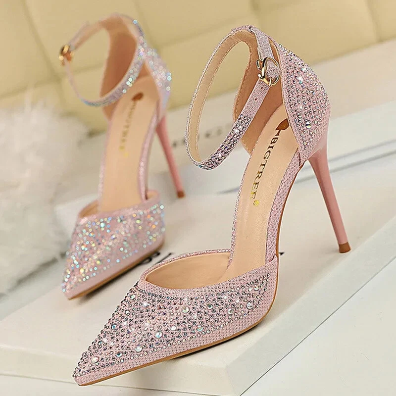 Women Shiny Rhinestones High Heels Ankle Strap Stilettos Sandals Pumps Shoes