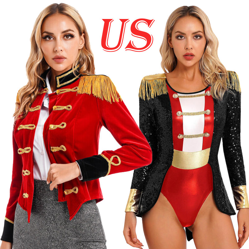 Women circus cosplay bodysuit designs with long sleeve, tassel epaulettes, button crotch and patchwork tails skirted.