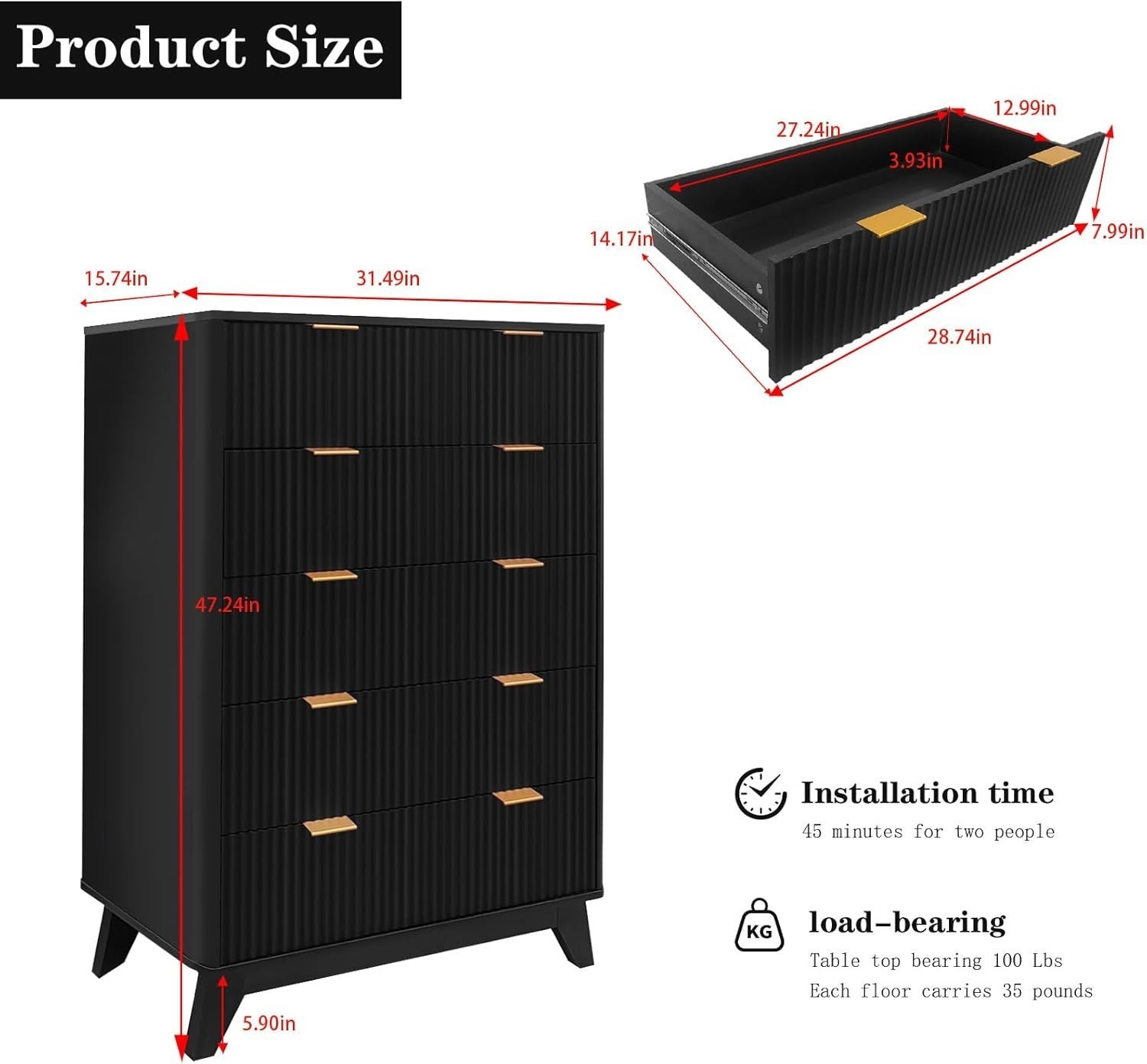 ---Modern Elegant Design: This five-drawer dresser showcases a stunning wave-like fluted panel that adds rich texture and visual interest to any room. The wide metal handles provide a striking contrast, while the splayed legs enhance its stability and style