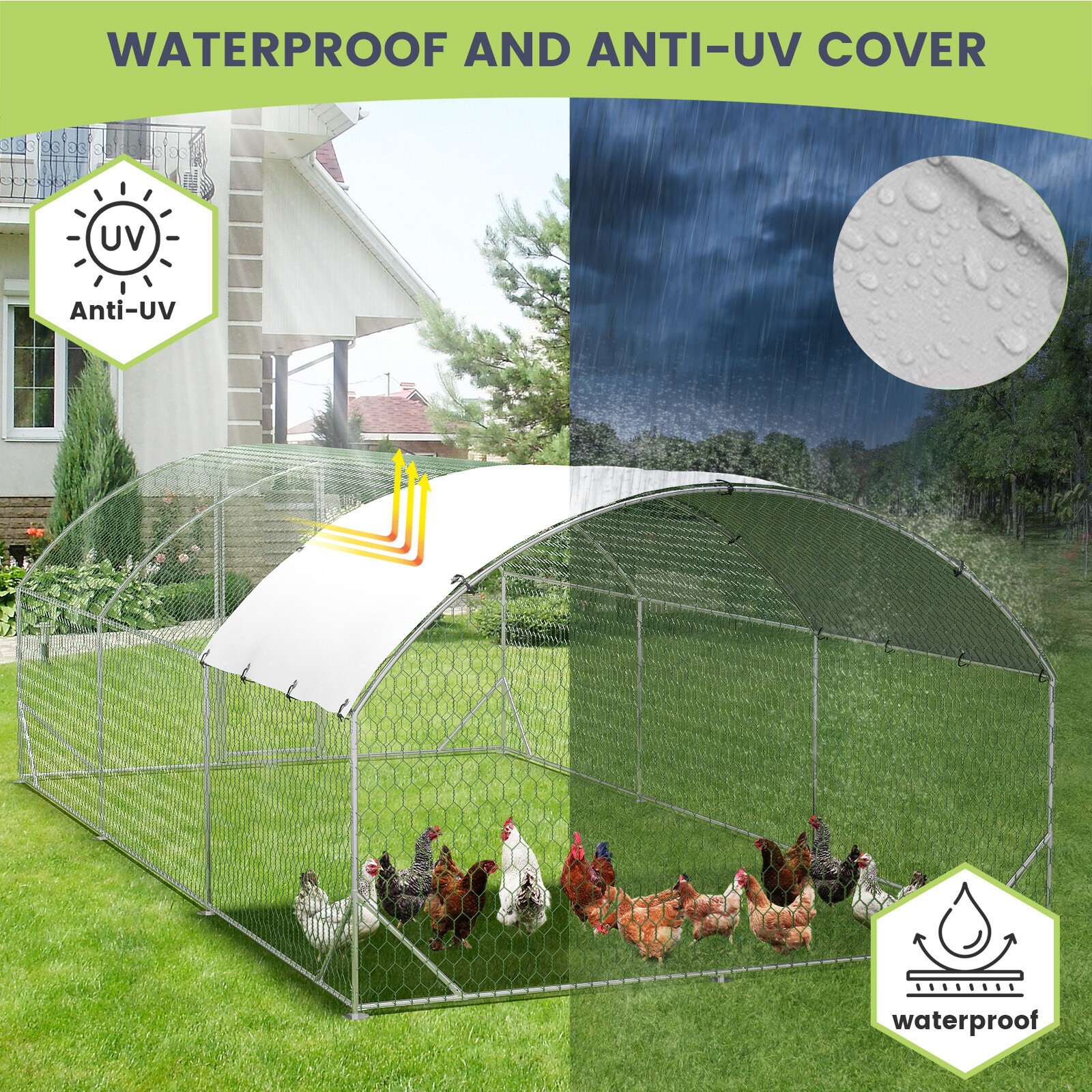 【ANTI-UV AND WATERPROOF COVER】 Our large outdoor chicken coop features an anti-UV and waterproof PE cover, providing ultimate outdoor protection for your animals. The PE tarpaulin material protects against sun and rain, while the roof's slope design ensures efficient water drainage to prevent accumulation. Your animals will appreciate the safe and comfortable outdoor living space provided by this coop.