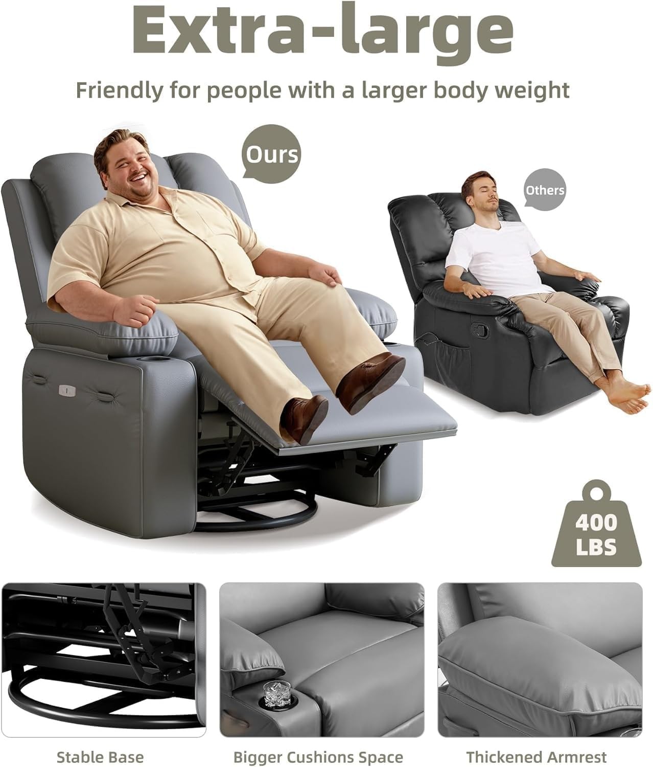 [Size] This recliner boasts a spacious seat 22 inches wide; Reclines to 150° and supports up to 400 lbs; Fits big guys better (up to 6'8")