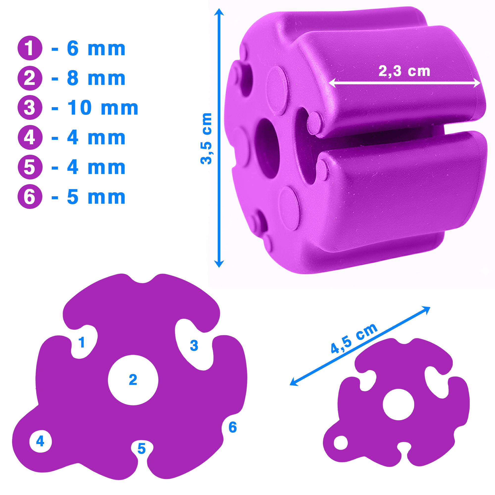 - Dimensions des trous : 4 mm / 4 mm / 5 mm / 6 mm / 8 mm / 10 mm (flexible - peut s'étirer)
