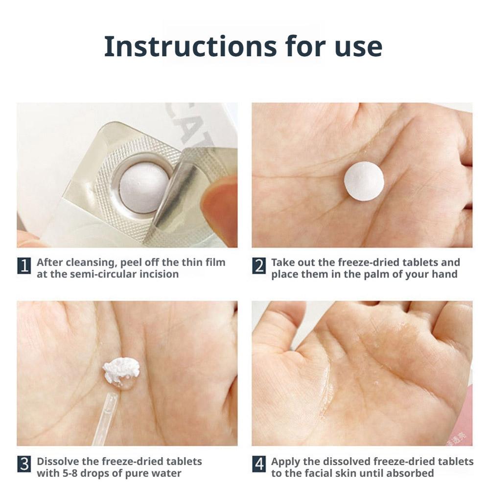 4. **Effortless & Targeted Application:** Designed for convenience, these essence tablets require no complex mixing or additional solvents. Simply dissolve with a few drops of purified water directly in your palm, and gently apply to your face. This straightforward routine quickly stabilizes your skin's foundation and boosts its natural self-repairing capabilities, initiating visible improvements in mere seconds.