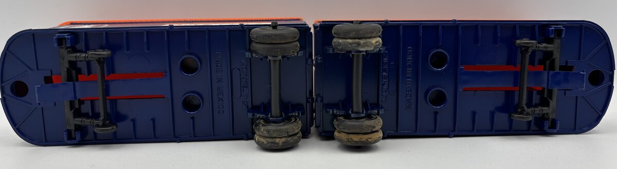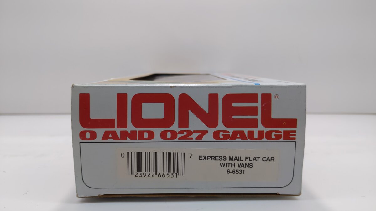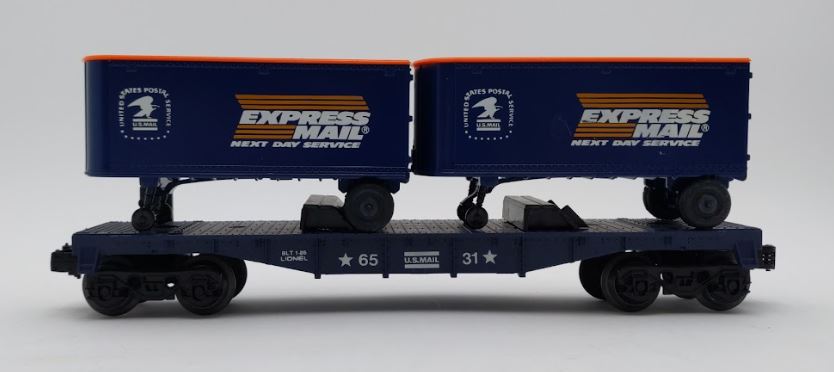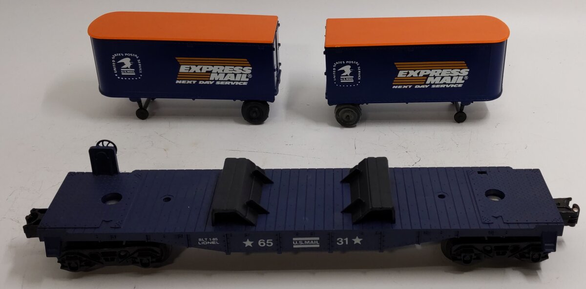 Here is a Lionel 6-6531 O Gauge Express Mail Flatcar with Piggyback Trailers from 1984-85. It features a durable plastic construction with two removable USPS trailer vans, plastic trucks, metal wheels and axles, and operating knuckle couplers.