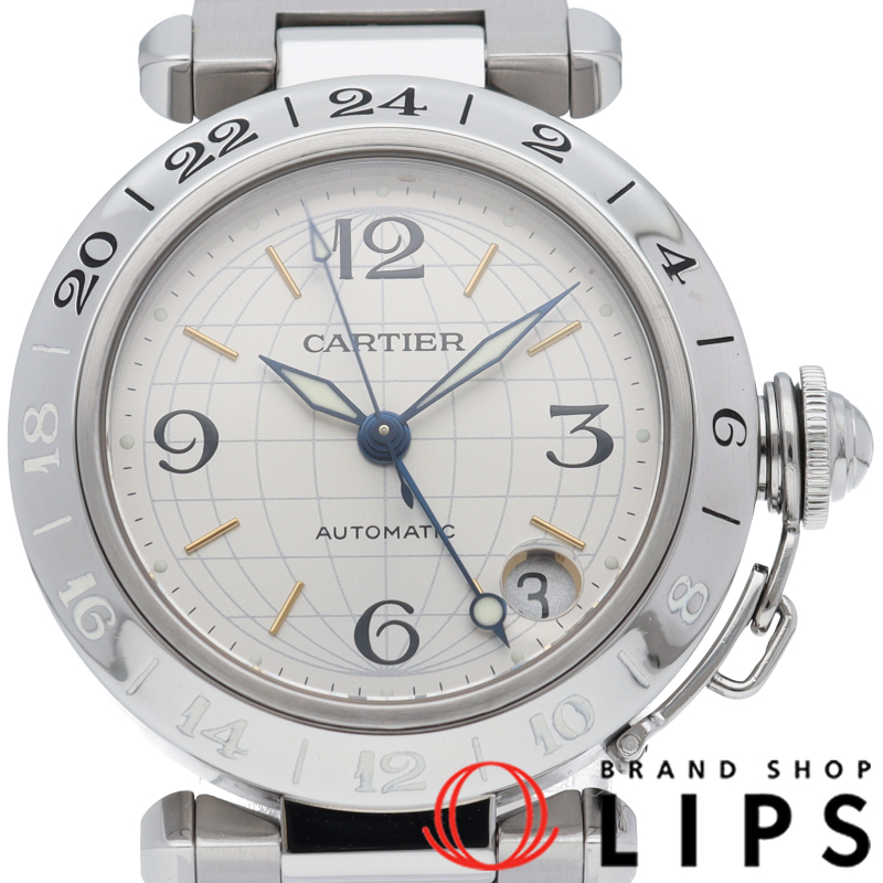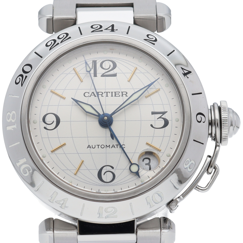 | Cartier's popular "Pasha C" series. A model equipped with a GMT function that has a radial design with a globe motif on the dial. |