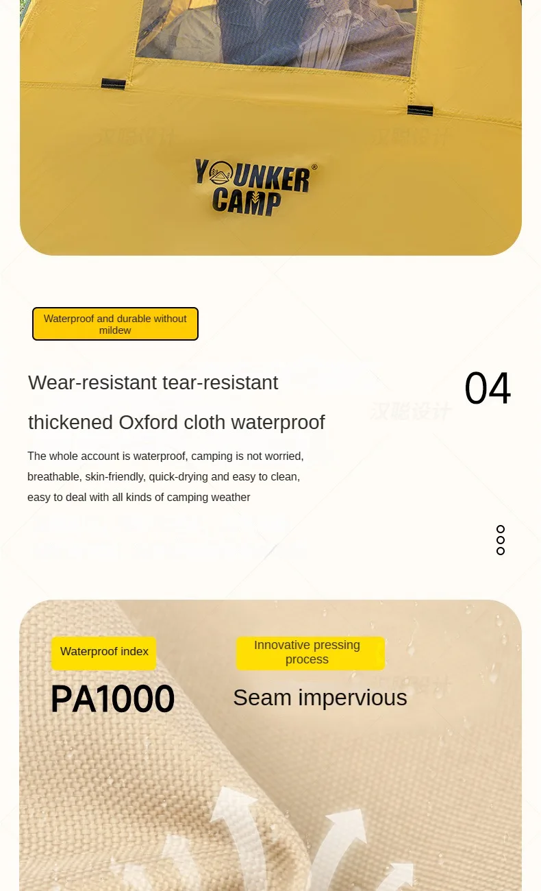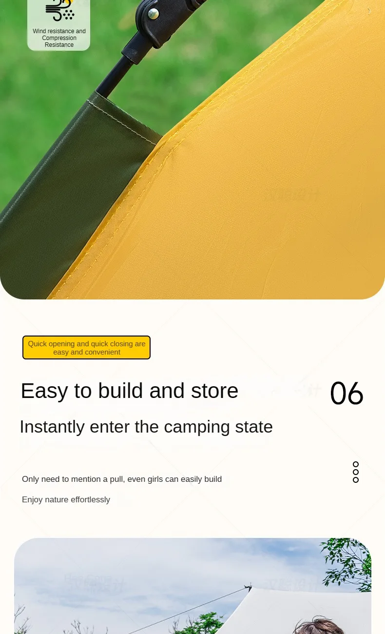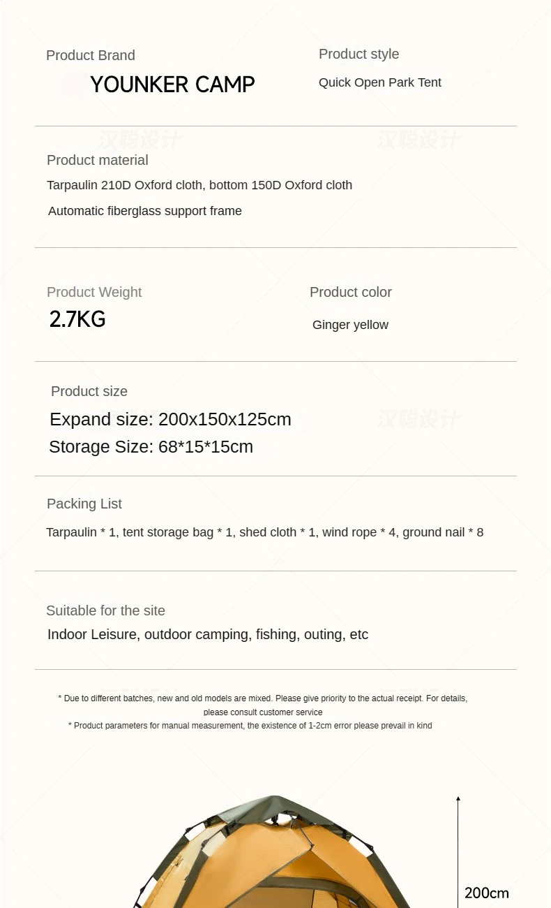 2.Material:Tarpaulin 210D Oxford cloth waterproof 1000, bottom 150D Oxford cloth waterproof, automatic fiberglass support frame with a diameter of 7.9mm, 4 wind ropes and 8 grounding wires
