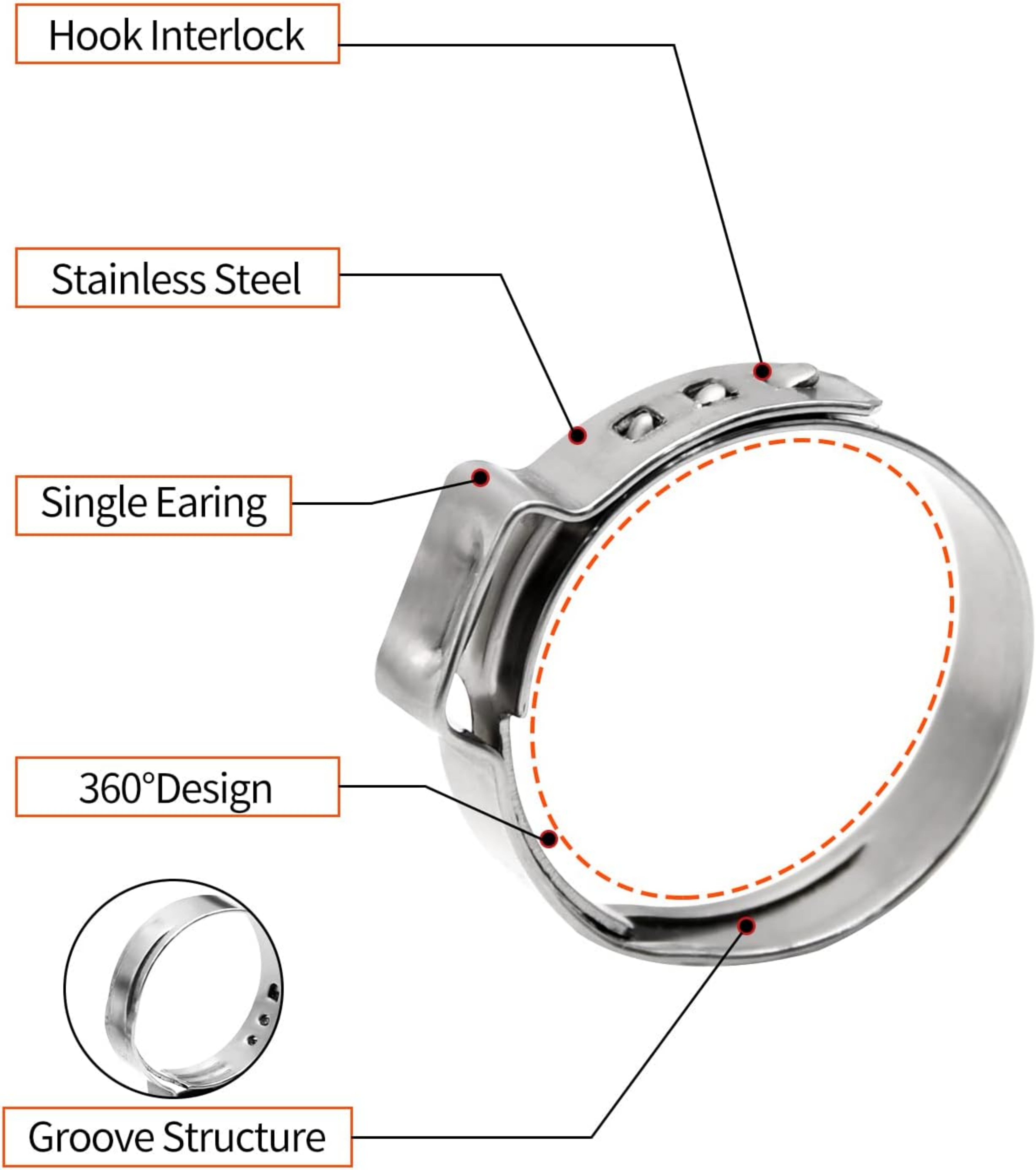 【Single Ear Design】- Single ear hose clamps adopt 360° design which provides a more concentrated sealing pressure. Special cochlear design provides a strong thermal expansion compensation function, which can makes the hoses always sealed regardless of the size change of the hose.