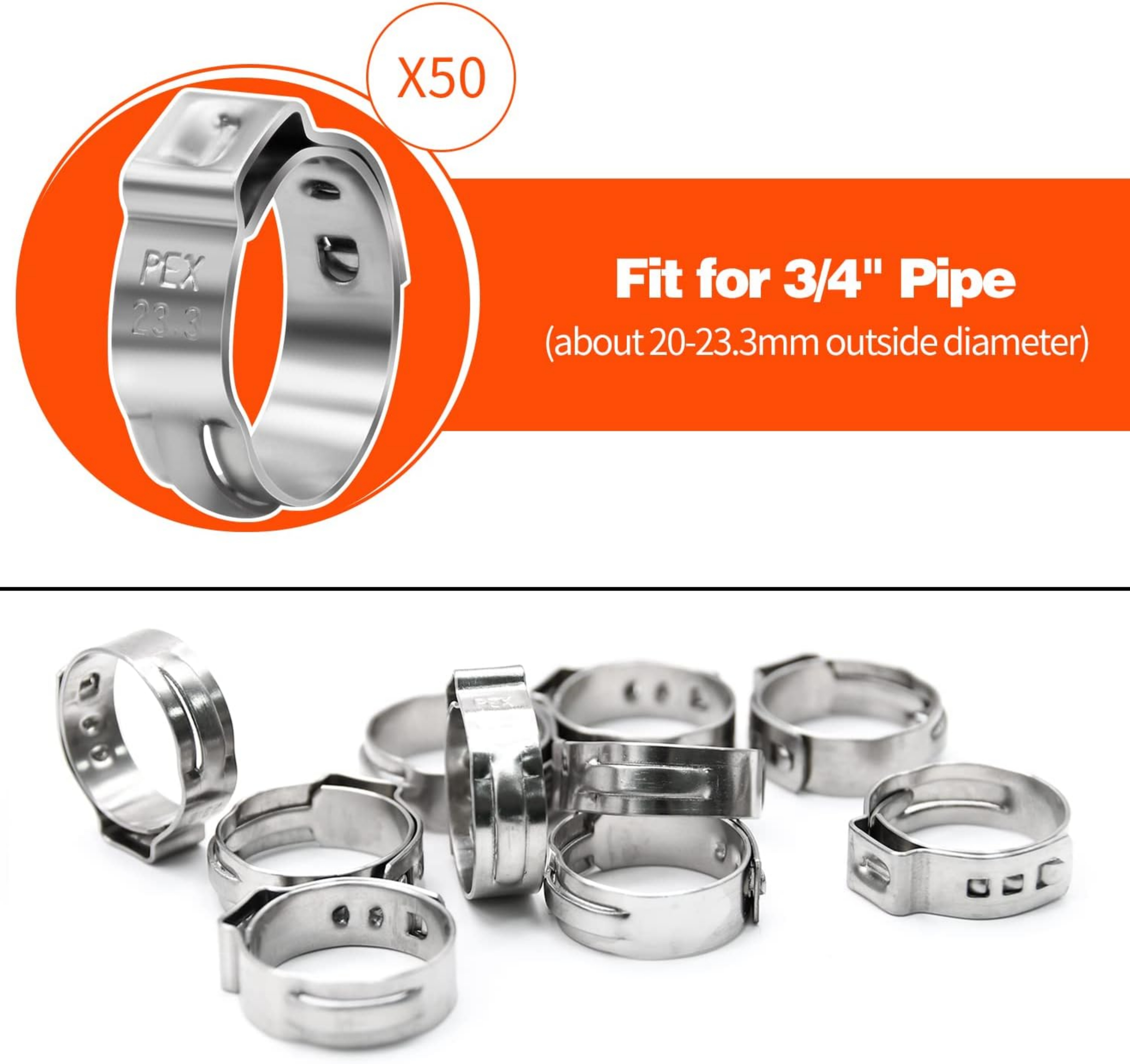 【50pcs PEX Clamps】- PEX cinch clamps set includes 50 pack 3/4" PEX cinch clamps, these 3/4" cinch clamps fit for 3/4 inch PEX pipes, they are widely used in plumbing systems.