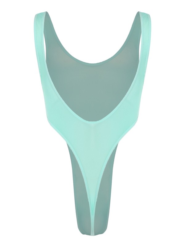 The high-cut design and bulge pouch are well-thought-out details, enhancing the overall aesthetic and functionality of the bodysuit.