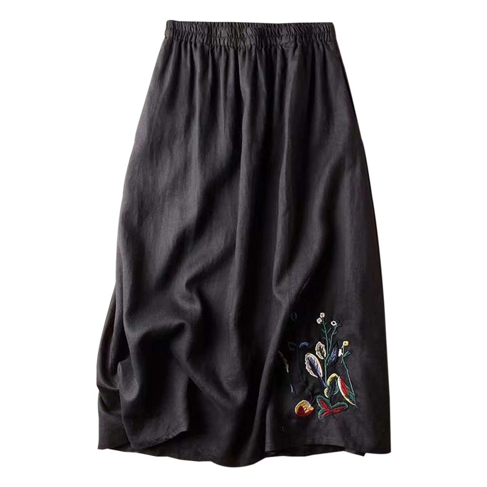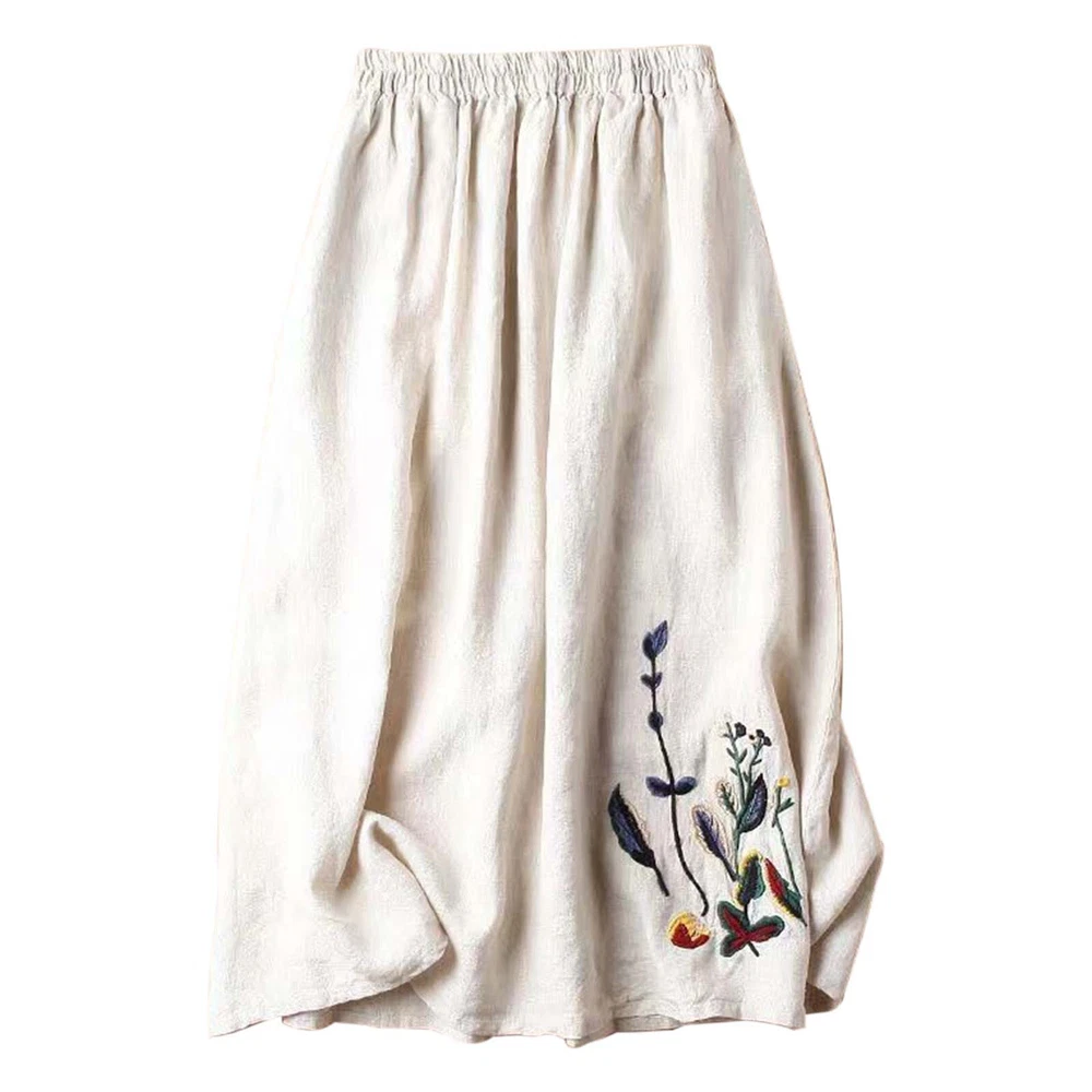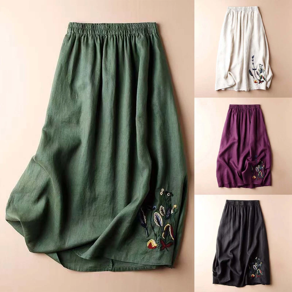 Women Floral Cotton Linen Skirt for Embroidered Summer A Line Midi Dress