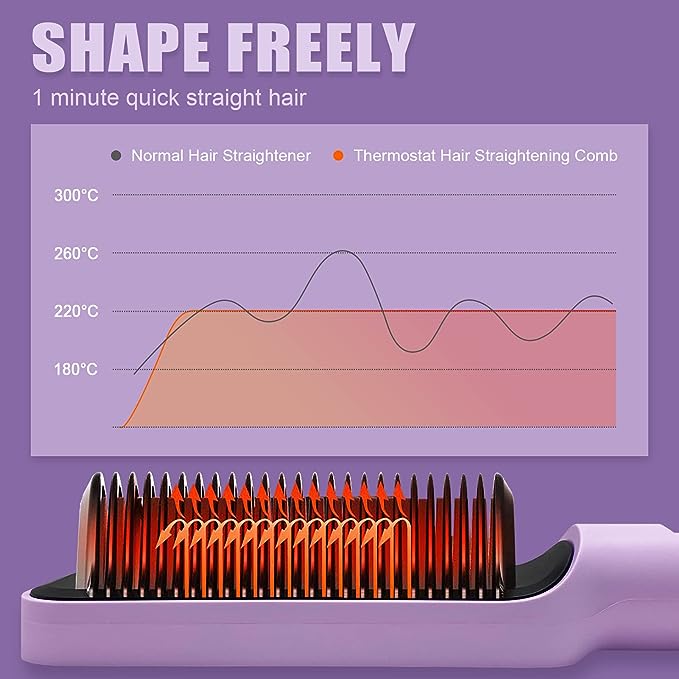 Our straightening brush offers a heat-resistant protective plate and anti-scalding comb teeth with built-in temperature lock. If no straightener is used for 10 minutes, it will turn off automatically ensure safety for you and your family