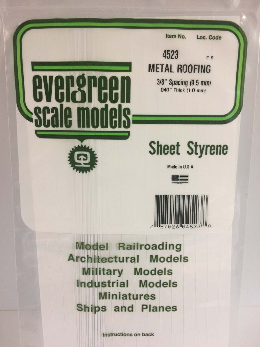 This is an Evergreen Scale Models 4523 .040 X .375 x 6 x 12 Opaque White Polystyrene Standing Seam Roofing.