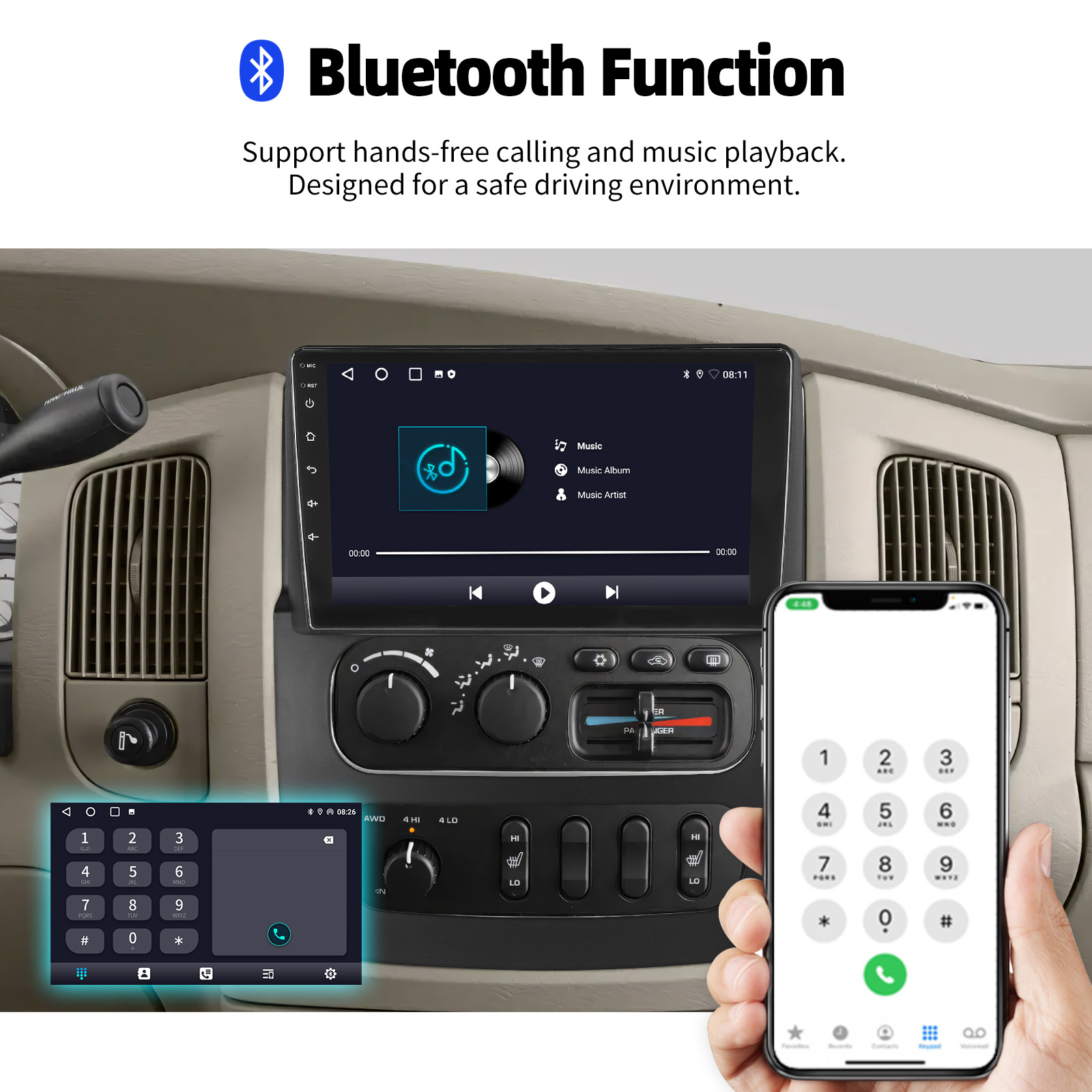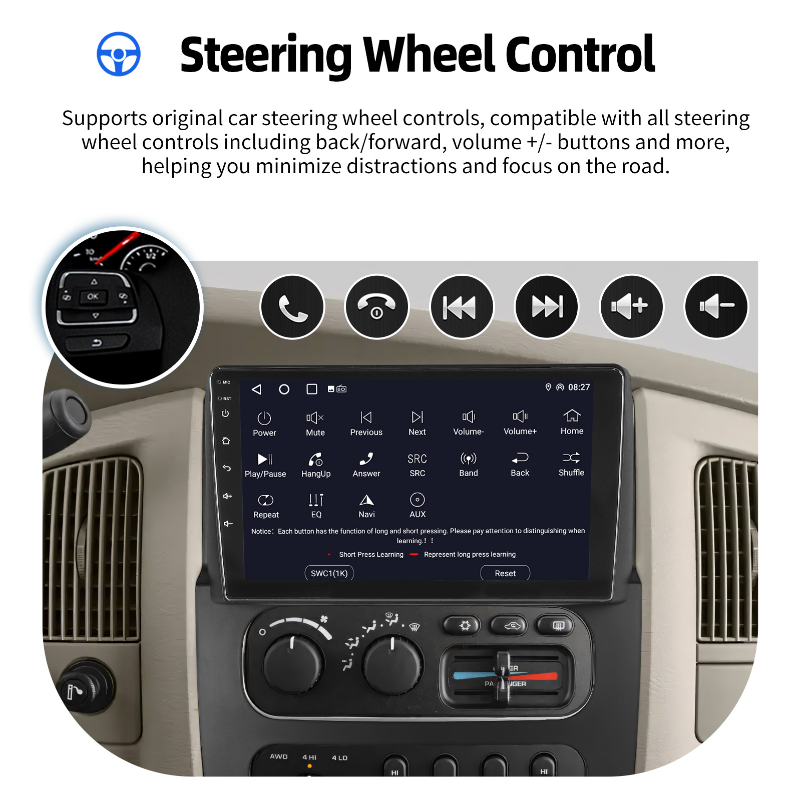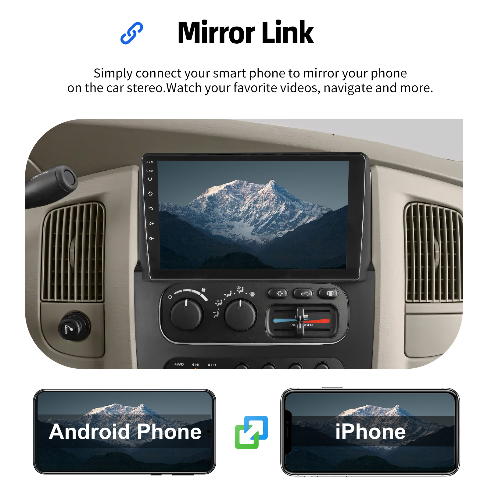 9 Inch Android 14 Car Radio For Dodge Ram 1500 2500 3500 2002-2005: The Android car radio with 9" 1280* 720 HD capacitive touchscreen, 2GB RAM and 32GB ROM allows you to download your favorite apps and videos, so driving is no longer boring. No extra frame, no cable change, plug and play.