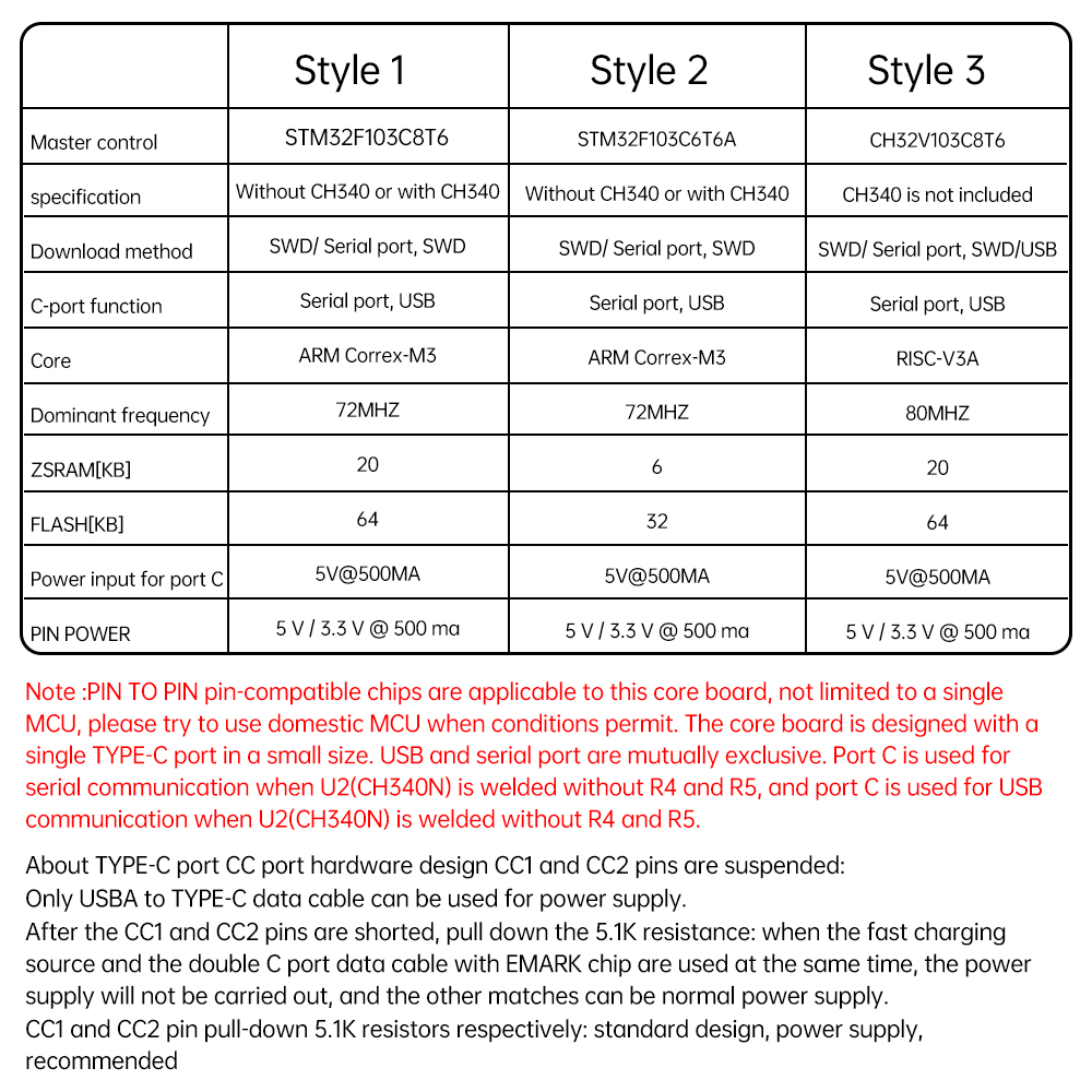 Core board for the pursuit of small size for a single TYPE-C port design, USB function and serial function for the two optional mutually exclusive design, welding U2 (CH340N) does not weld R4 and R5 when the C-port as a serial communication function, do not weld the U2 (CH340N) welded R4 and R5 when the C-port as a USB communication function to use.