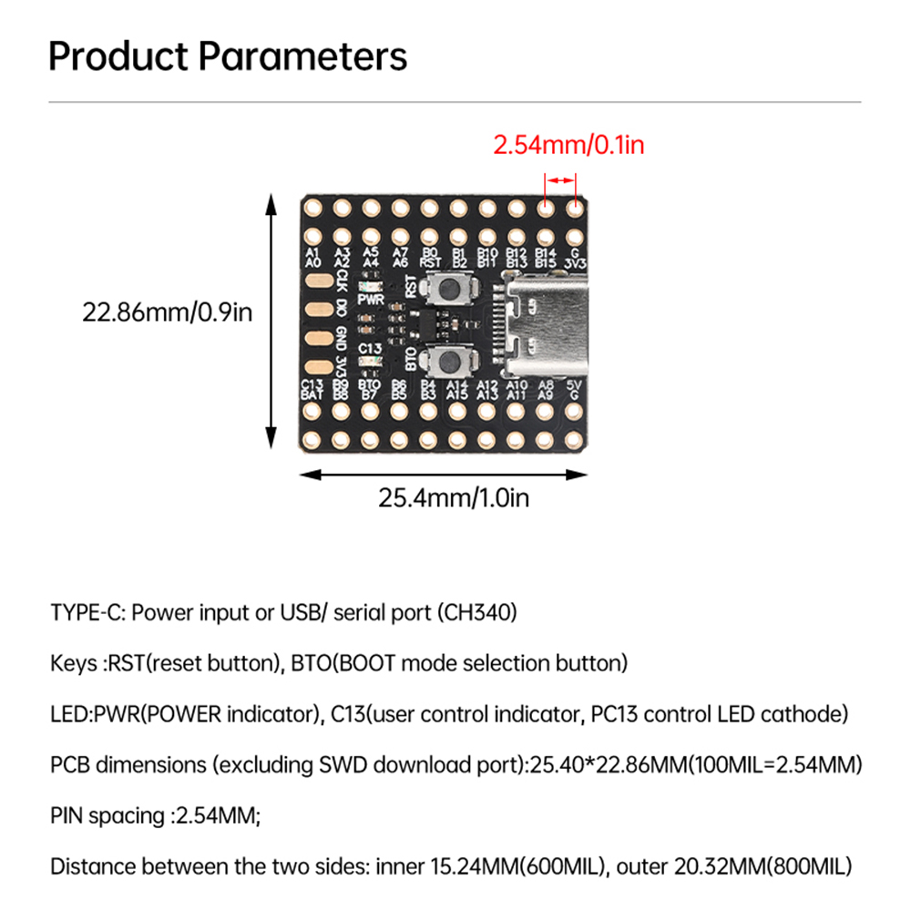 PCB external dimensions (excluding SWD download port): 25.40 * 22.86MM (100MIL = 2.54MM)