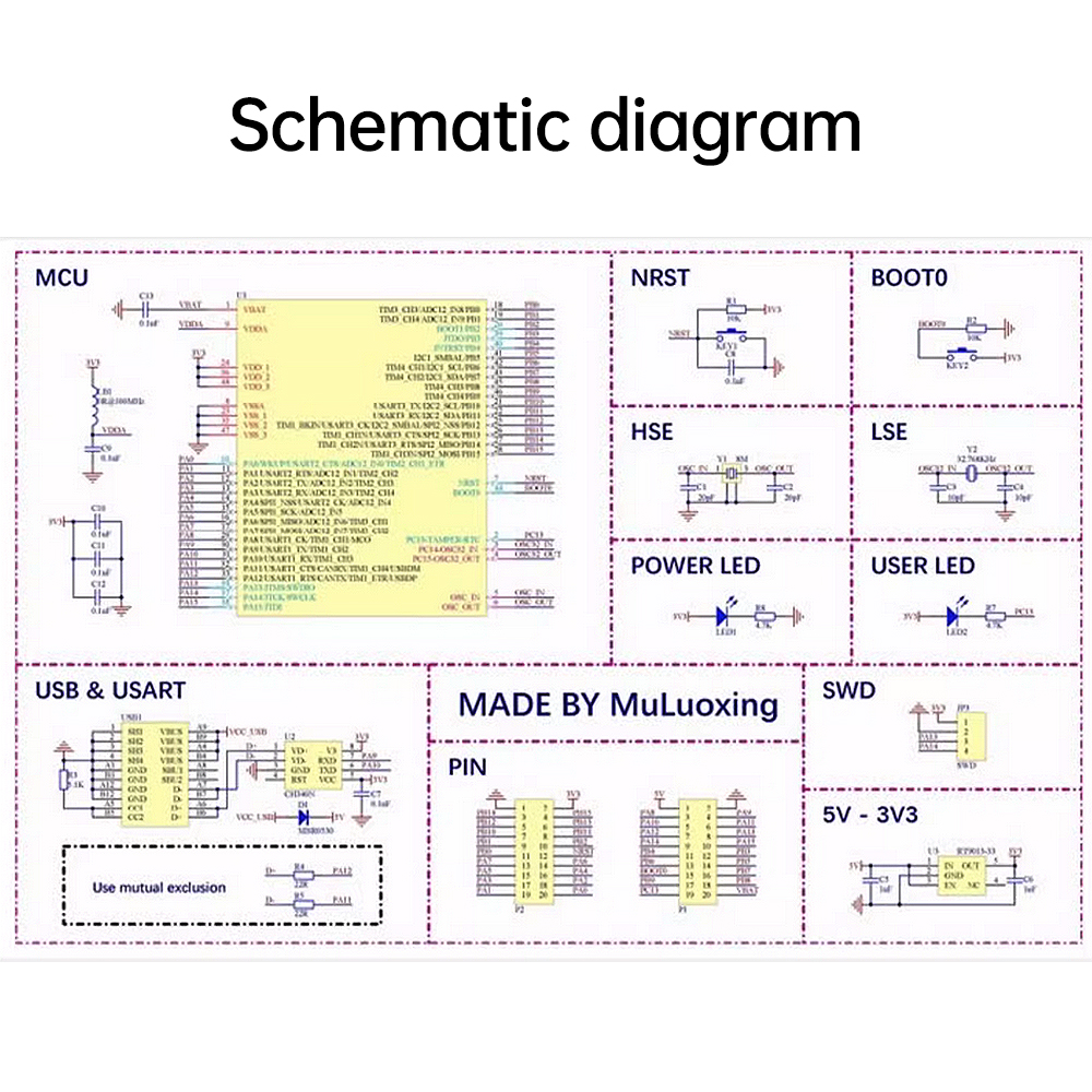 Note: PIN TO PIN pin compatible chips are applicable to this core board, not limited to a single MCU, conditions allow, please try to use domestic MCU.