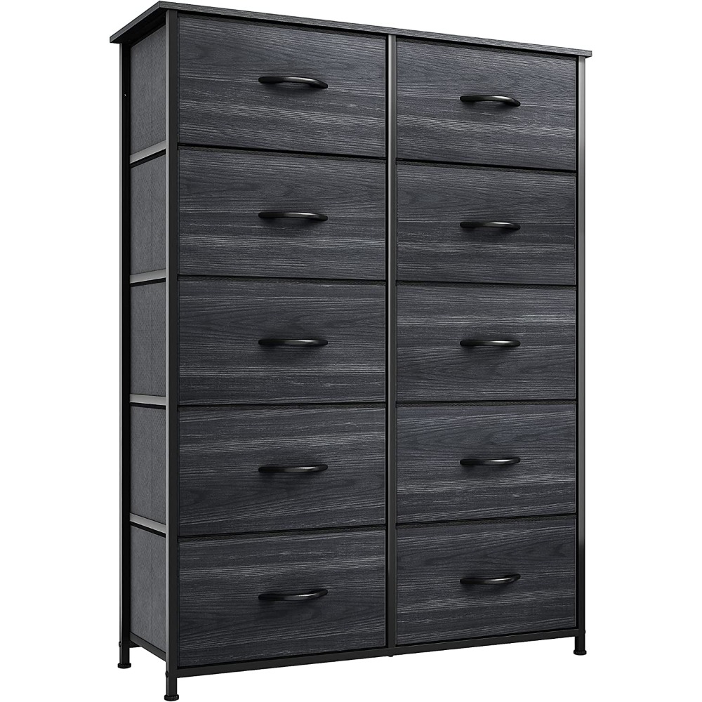 QUALITY CONSTRUCTION- Structured with a powerful metal frame and a durable MDF wooden top; Contains 10 removable drawers with easy-to-pull wooden handles; Held up by 4 adjustable plastic legs that prevent scratches to your floor; The innovative crossbar design on the back enhances product stability; The dresser can be secured to a wall with screws