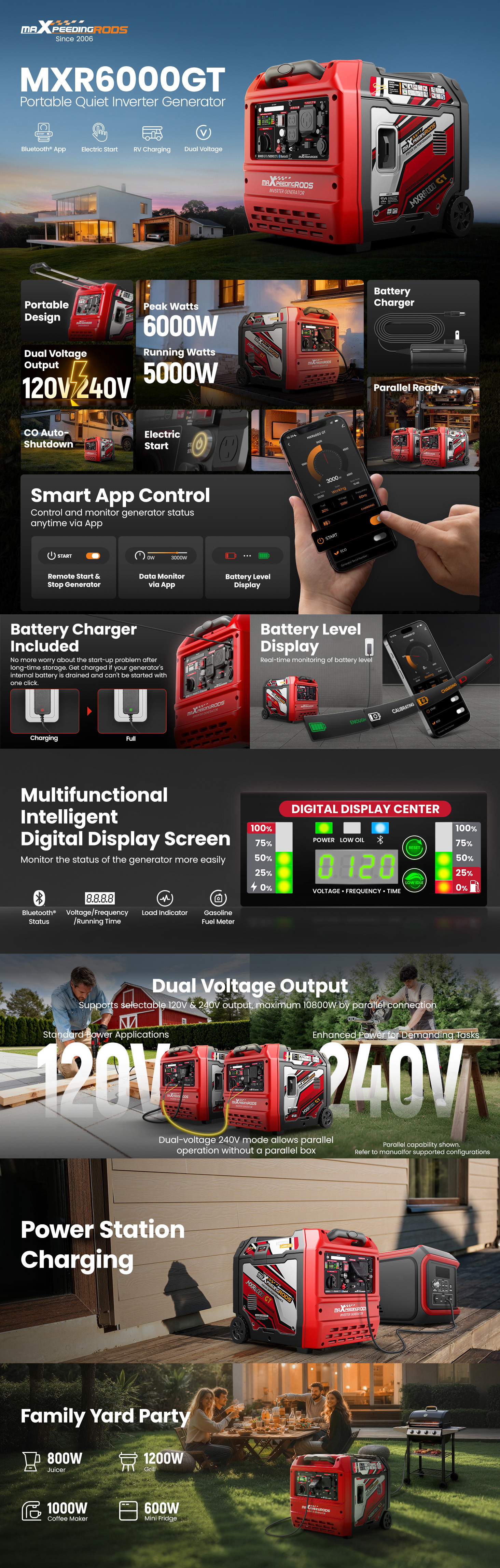 【Powerful Engine】Driven by a robust 224cc OHV engine, it delivers 6000W starting watts and 5000W running watts on gasoline—effortlessly powering multiple devices simultaneously.