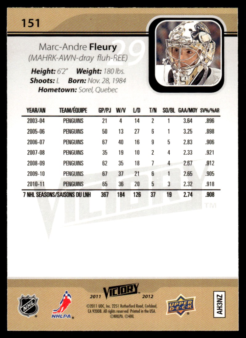 | 2011-12 Upper Deck Victory Marc-Andre Fleury Pittsburgh Penguins #151 |
