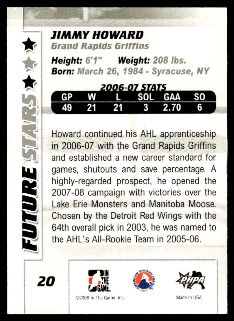 | 2007-08 In The Game Between the Pipes Jimmy Howard Grand Rapids Griffins #20 |
