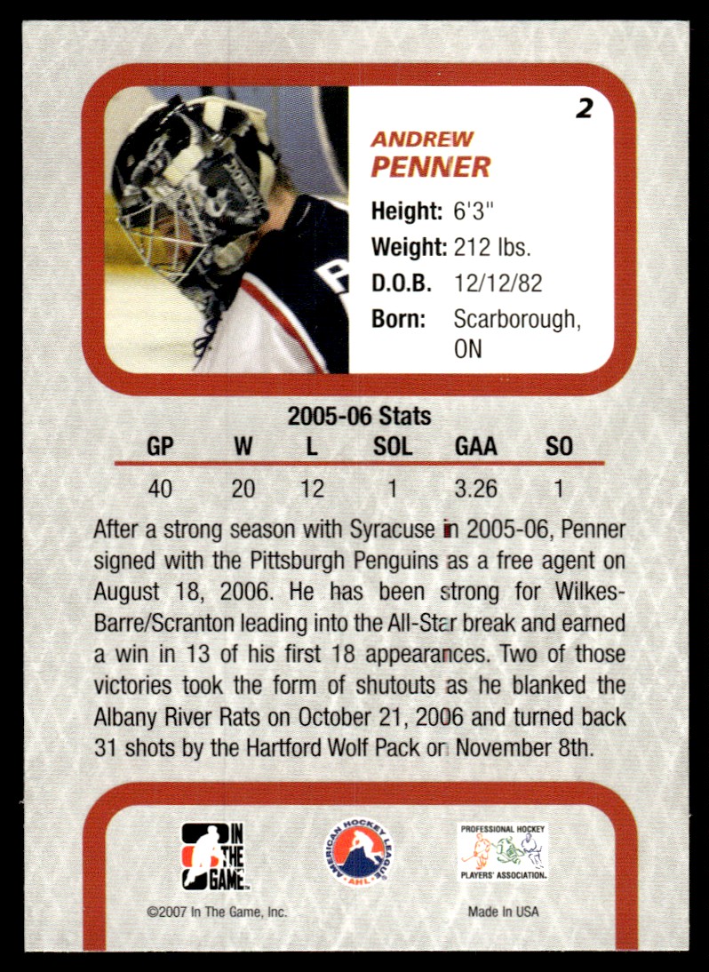 | 2006-07 In The Game Between the Pipes Andrew Penner Wilkes-Barre/Scranton |