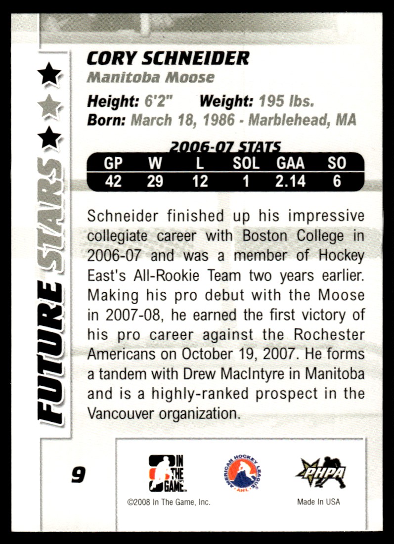 | 2007-08 In The Game Between the Pipes Cory Schneider Manitoba Moose #9 |