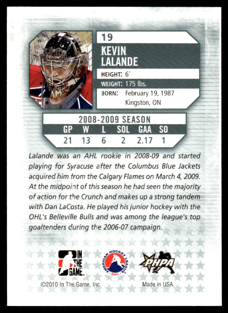 | 2009-10 In the Game Between the Pipes Kevin Lalande Syracuse Crunch #19 |