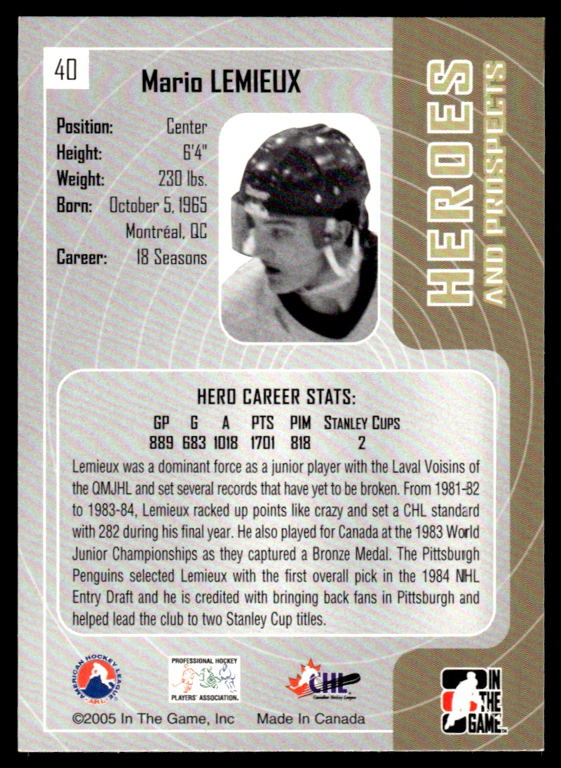 | 2005-06 In The Game Heroes and Prospects Mario Lemieux #40 |