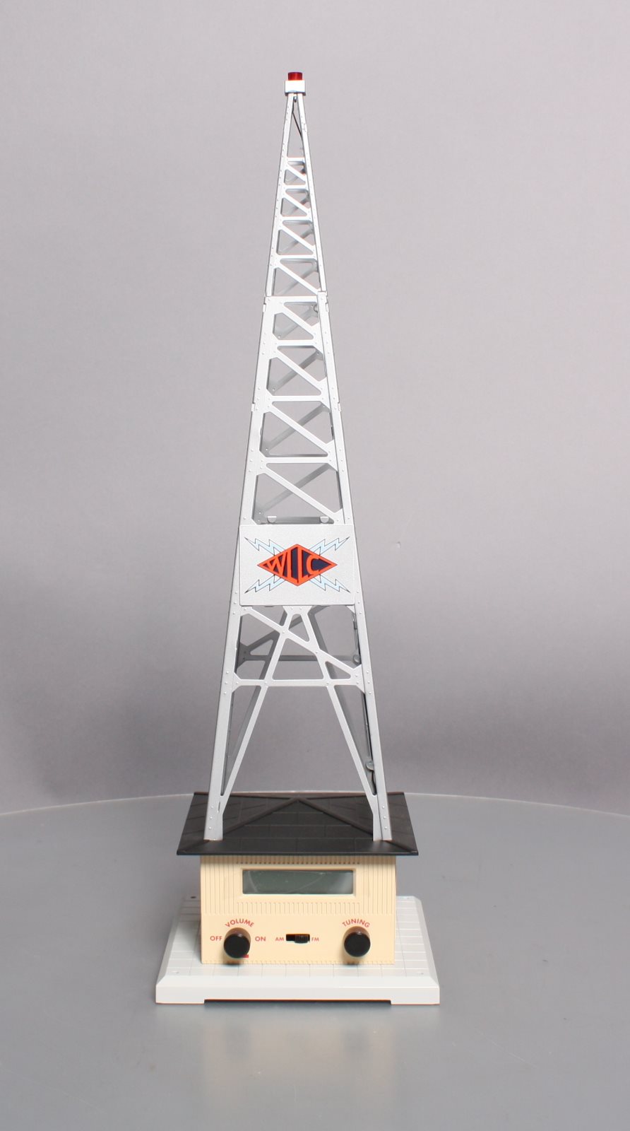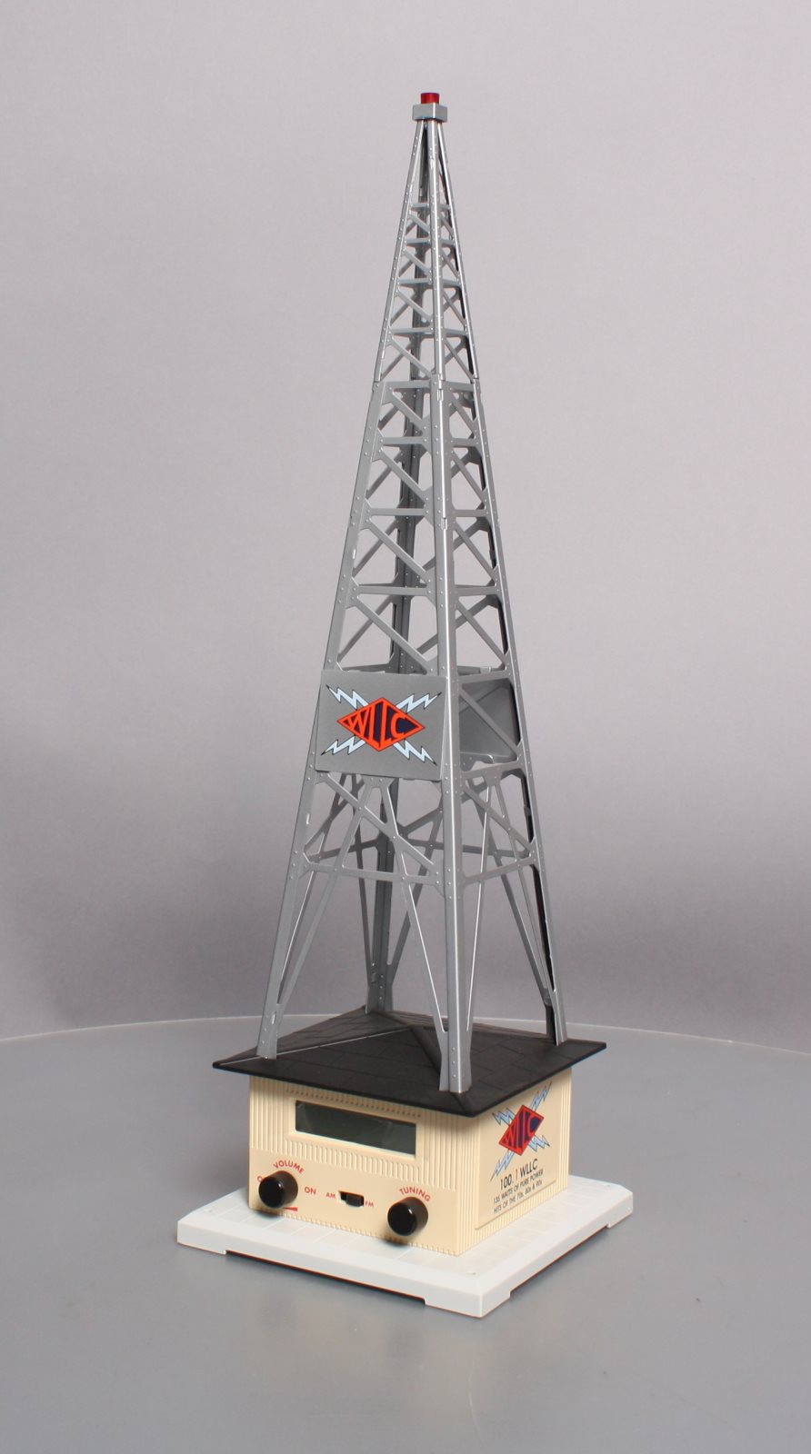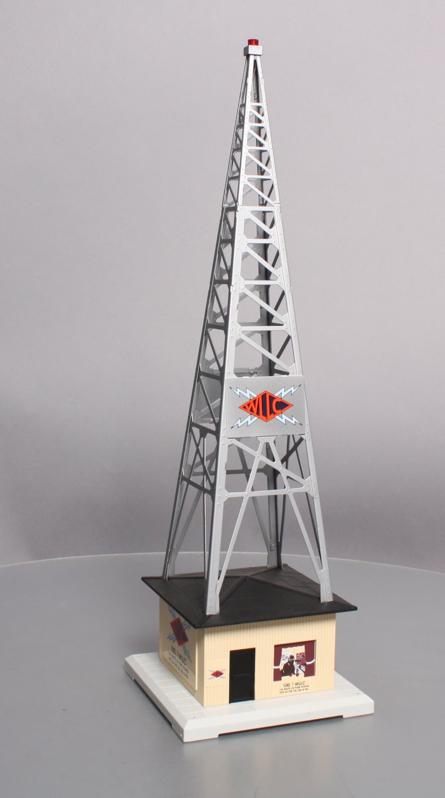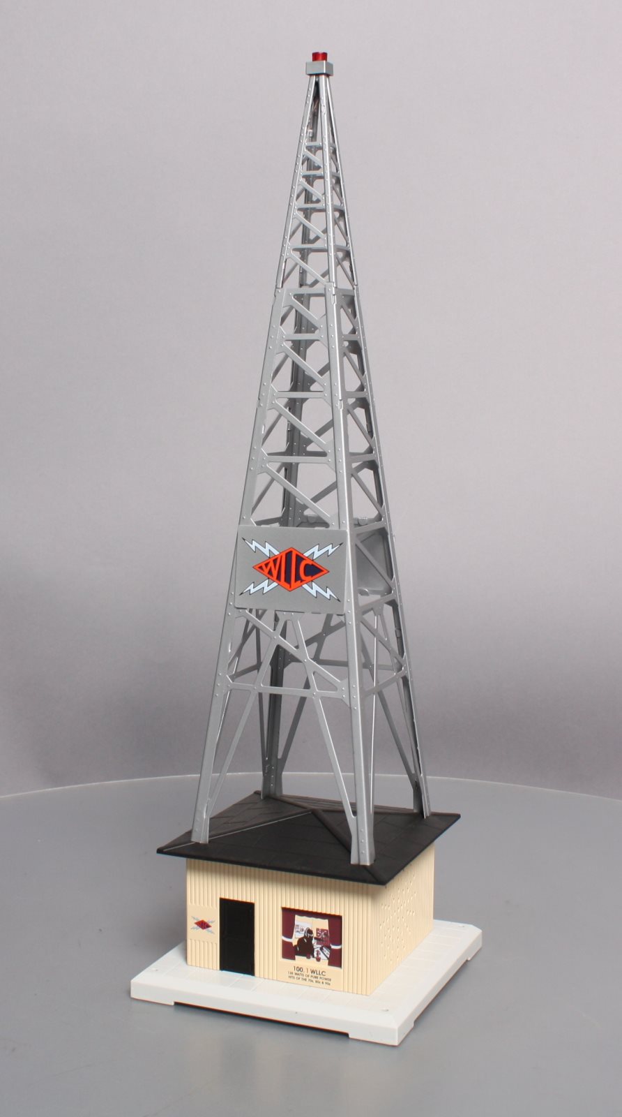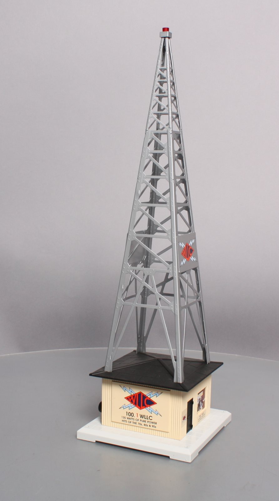 Here is a Lionel 6-32991 O Gauge WLLC Radio Station Tower. This cool & unique accessory plays your favorite music with a fully functional AM-FM radio. Adjust the tuning and volume knobs and you can broadcast live. It also features a stamped metal tower and call letters, detailed molded building & base, remote, and a realistic slow-strobe light. Tower measures : 6" x 6" x 19" and will operate with "O27" & "O" gauge Lionel, K-Line, MTH, Williams, and others.