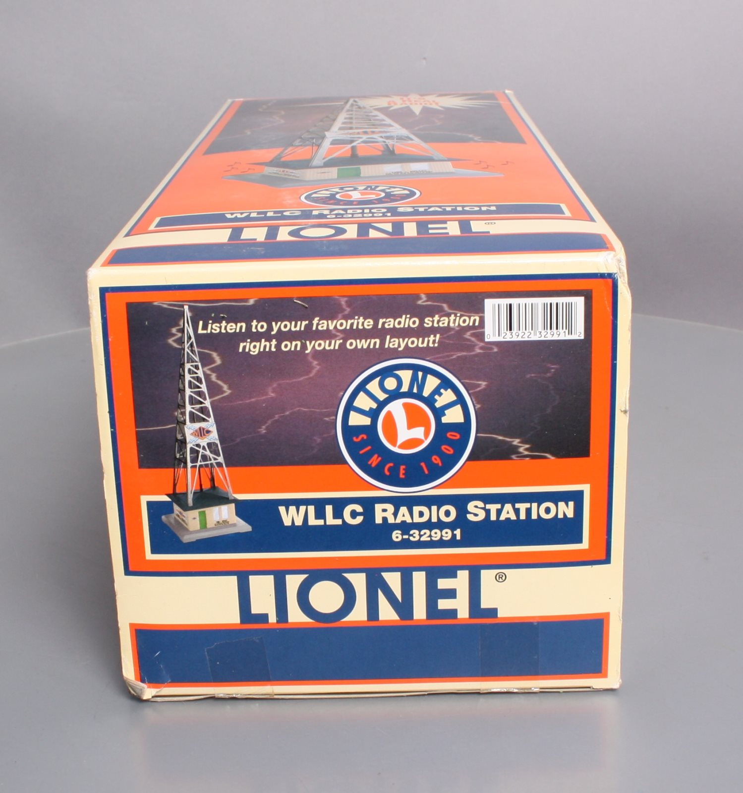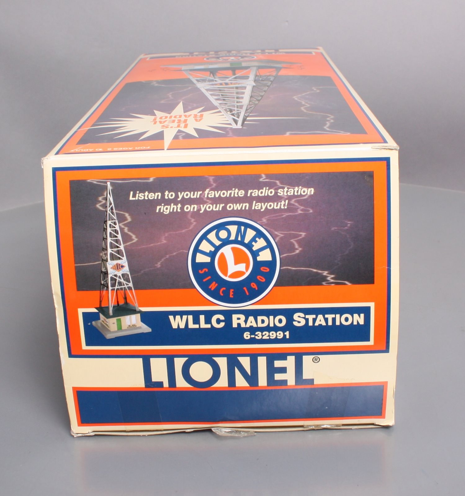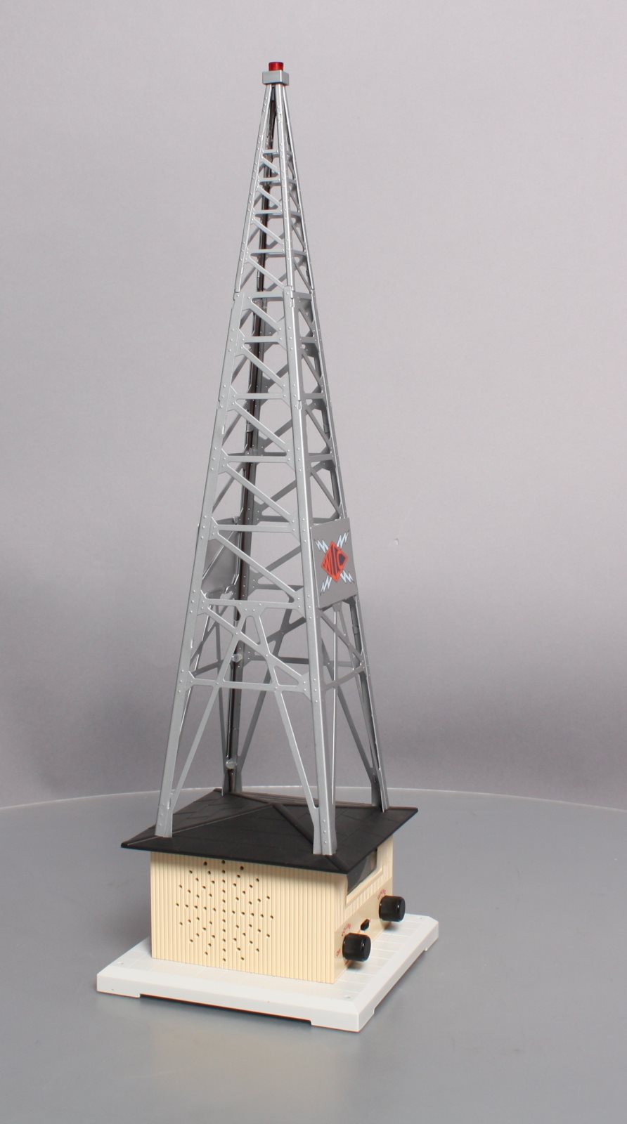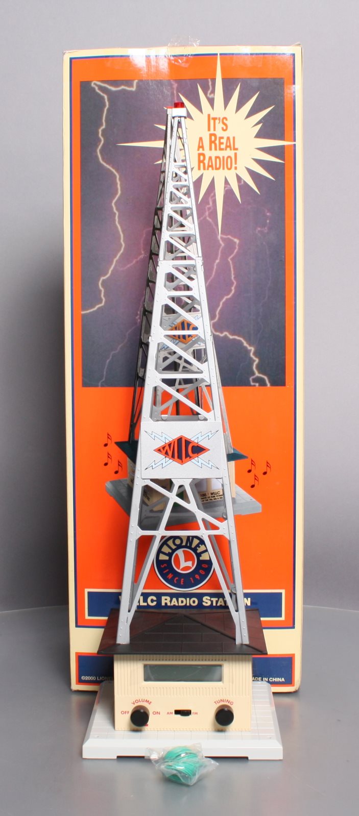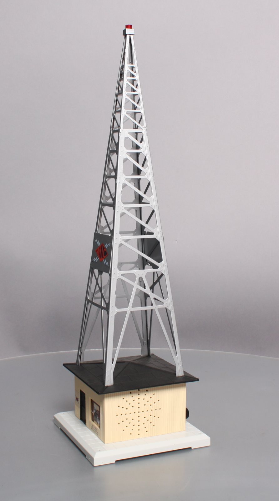 Here is a Lionel 6-32991 O Gauge WLLC Radio Station Tower. This cool & unique accessory plays your favorite music with a fully functional AM-FM radio. Adjust the tuning and volume knobs and you can broadcast live. It also features a stamped metal tower and call letters, detailed molded building & base, remote, and a realistic slow-strobe light. Tower measures : 6" x 6" x 19" and will operate with "O27" & "O" gauge Lionel, K-Line, MTH, Williams, and others.