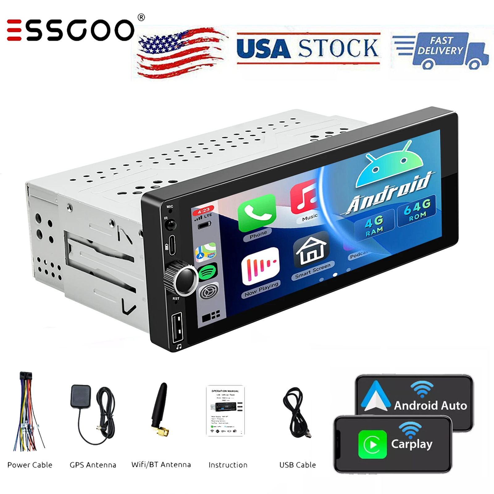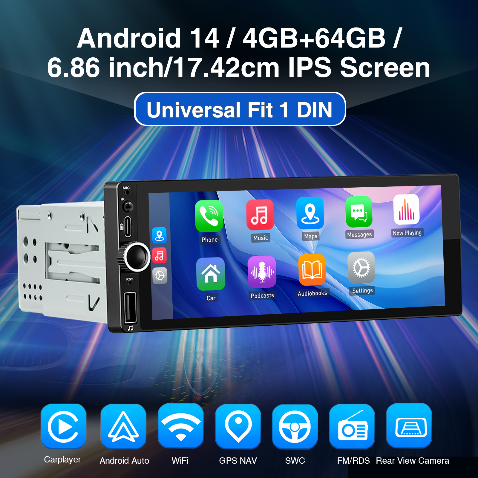 1 DIN Android 14 Car Radio with Touch Screen – The Android car radio with 6.86 inch IPS capacitive touch screen, 4GB RAM and 64GB ROM provides enough space to download your favourite apps and videos, so driving won't be boring anymore. 178x108x50(50mm) installation size, fits for most car with 1 DIN openning. With front USB input/USB type C, it supports fast mobile phone charging. With the rear microphone input, you can add a microphone to make your voice clearer (optional).