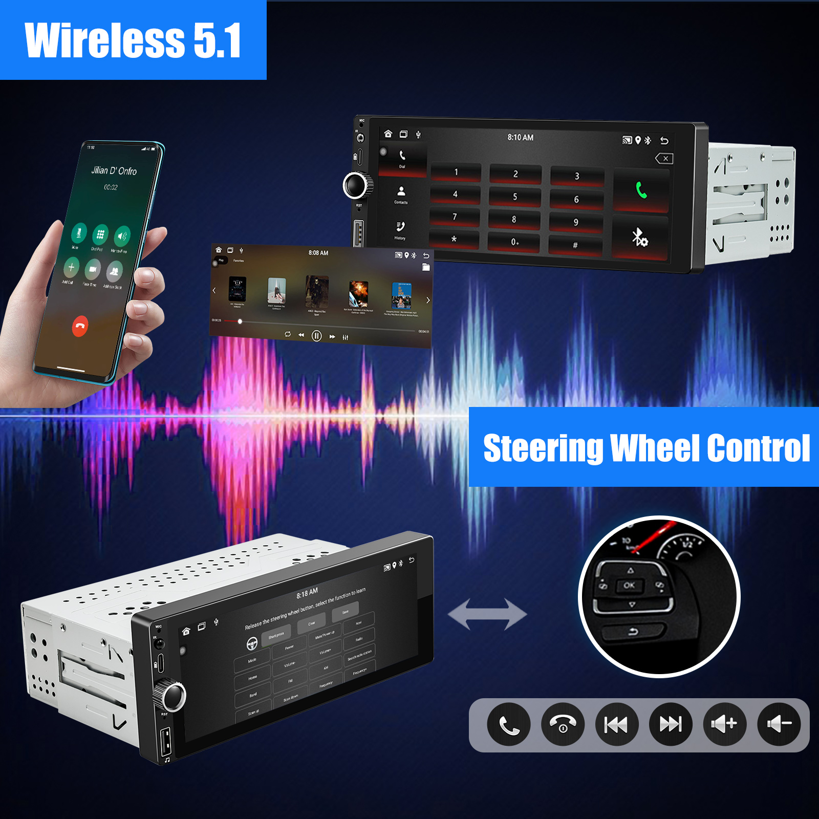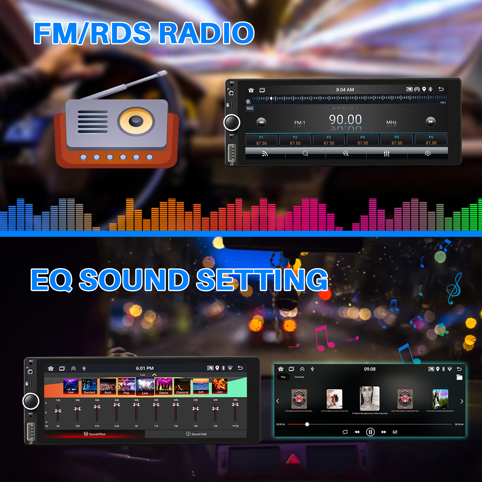 RDS/FM-Radio & Bluetooth & ASP Sound– Built-in Bluetooth 5.1 with A2DP, support Bluetooth hands-free calling, download phone book call logs, audio streaming music. Built-in microphone to make your call clearer. FM/RDS radio can preset 18 popular stations with high stereo quality, which can search channels fully automatic, semi-automatic and precise. Supports 32 band EQ setting, which can be adjusted according to your personal preference. Which is very similar to your original sound. 4 x 45W amplifier, surround sound and subwoofer output