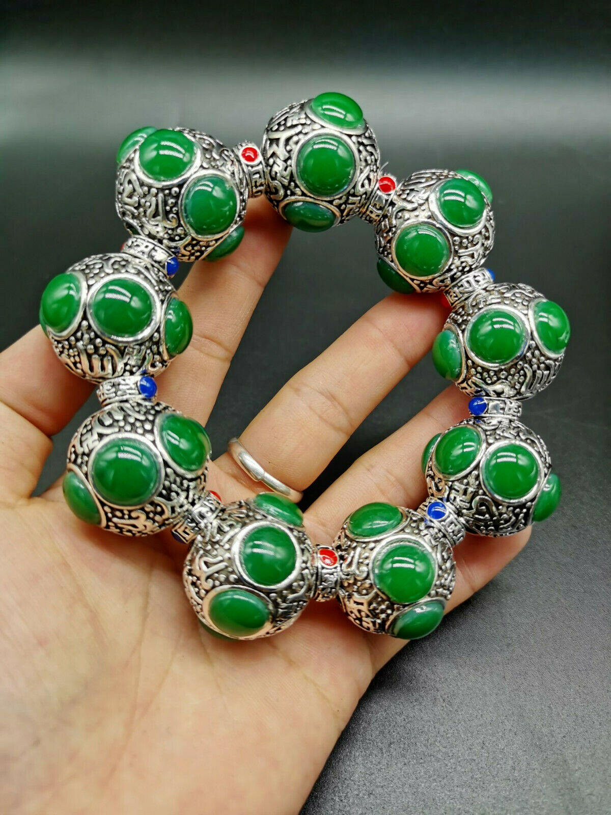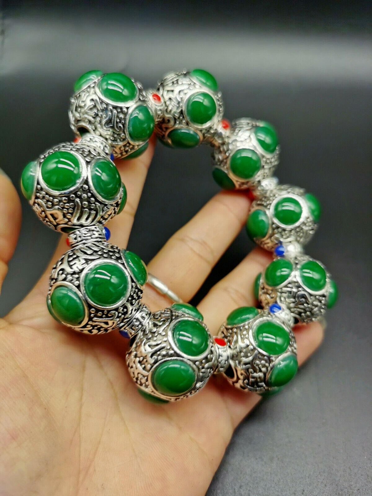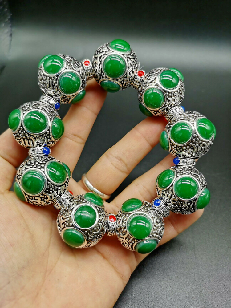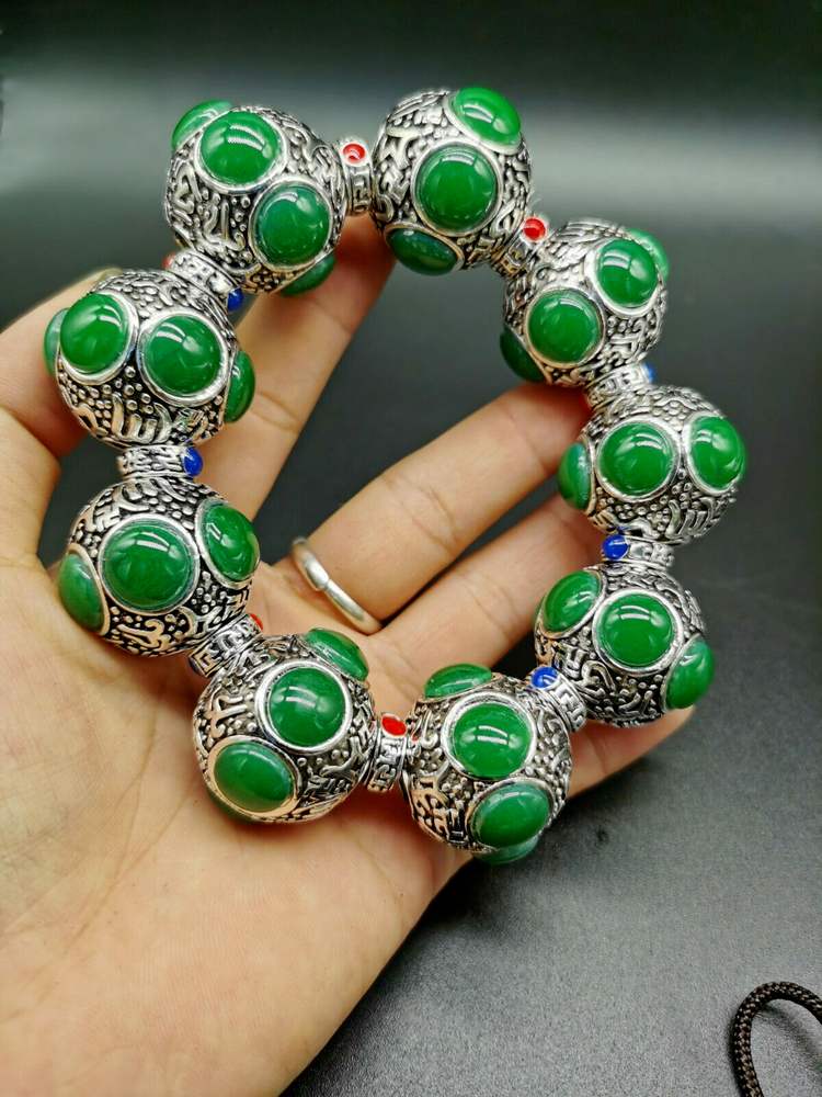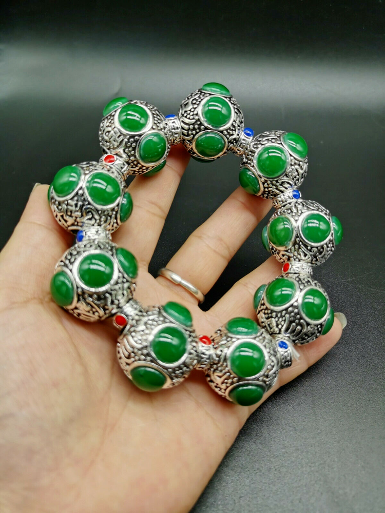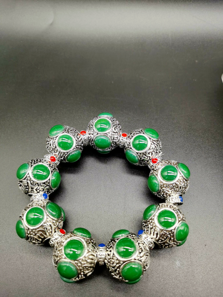 Tibet Silver Old Hand-carved Flower Tibetan Silver Inlaid Green Jade Bracelet