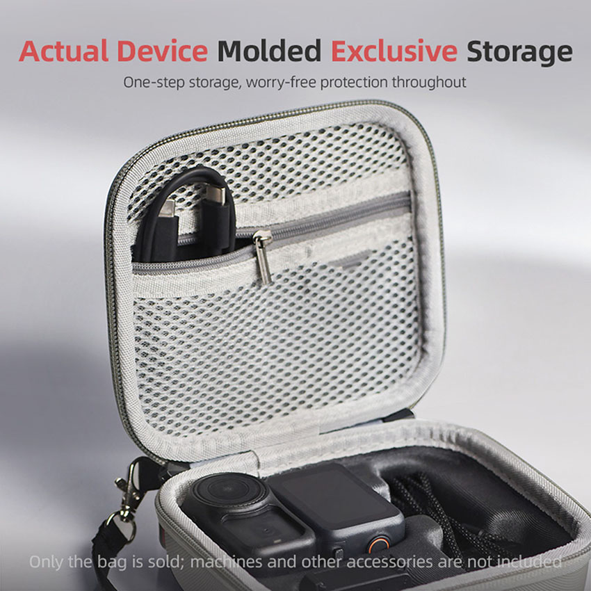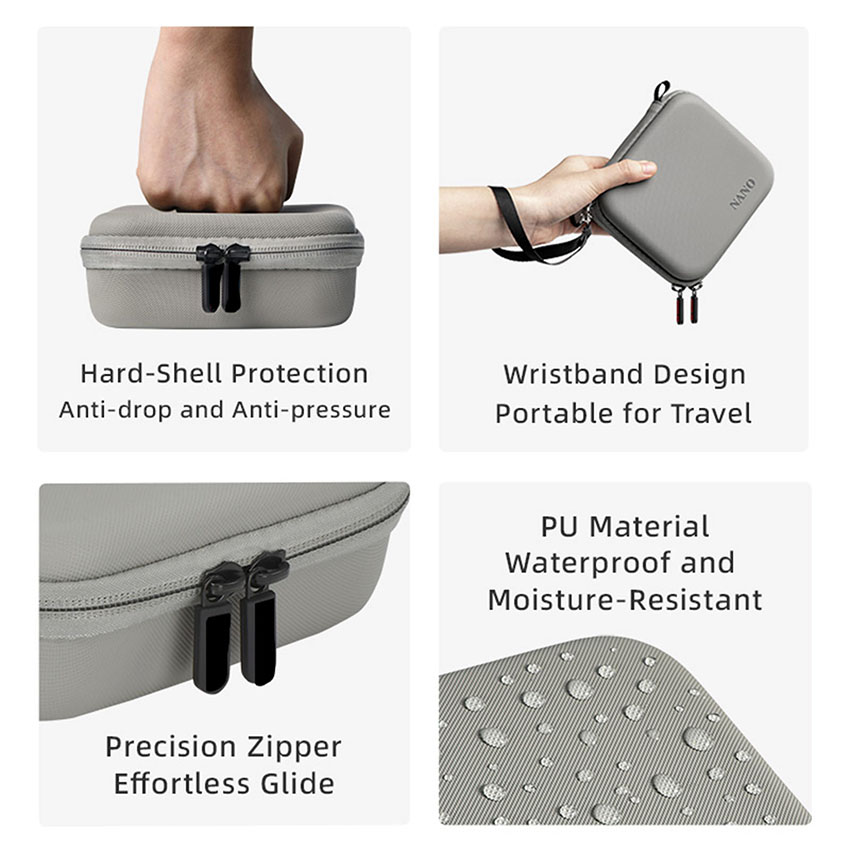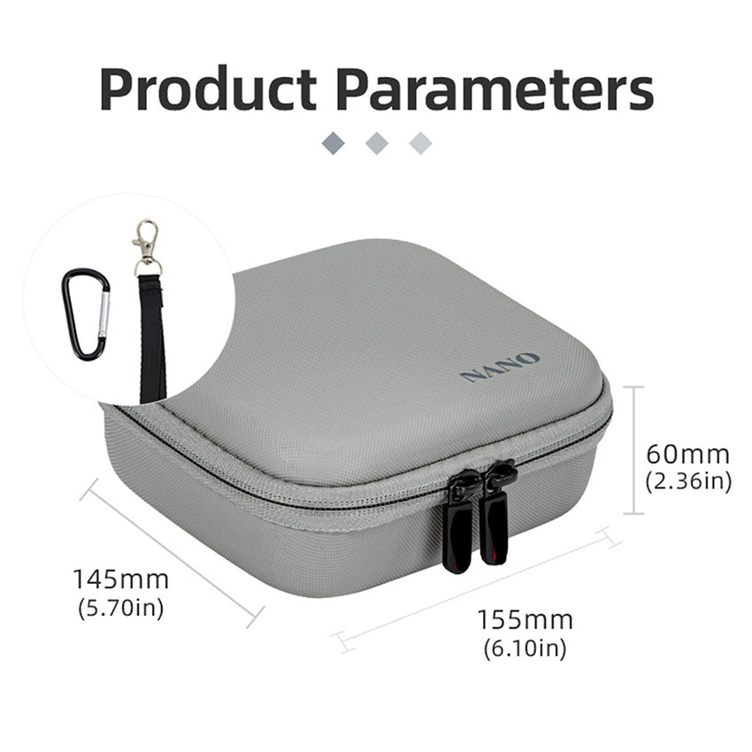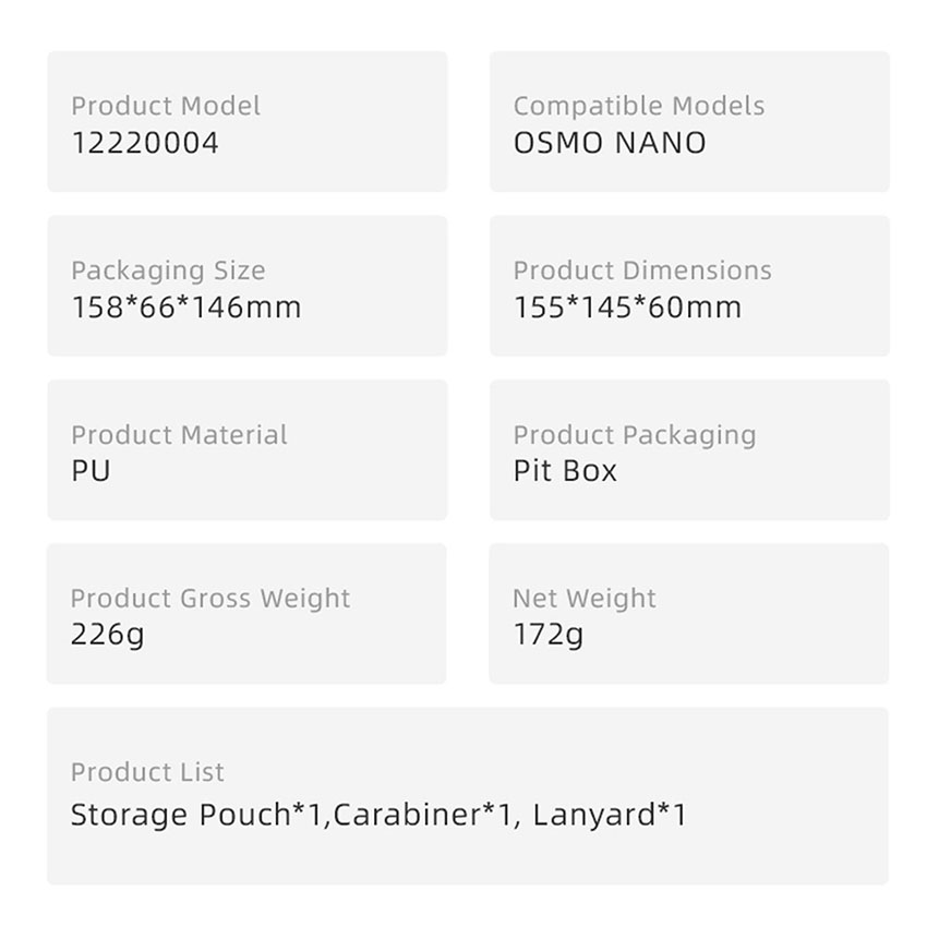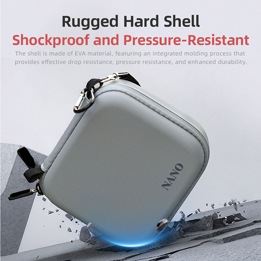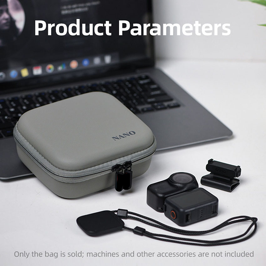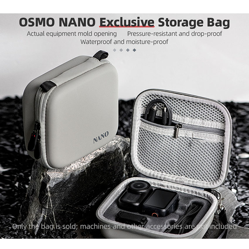 l Standard storage case designed specifically for the DJI OSMO NANO camera. Its interior features a well-organized layout that easily accommodates the camera body, magnetic lanyard, cap clip, and more. The mesh pocket on the top lid serves as a customizable storage space for accessories like expansion kits, data cables, and chargers