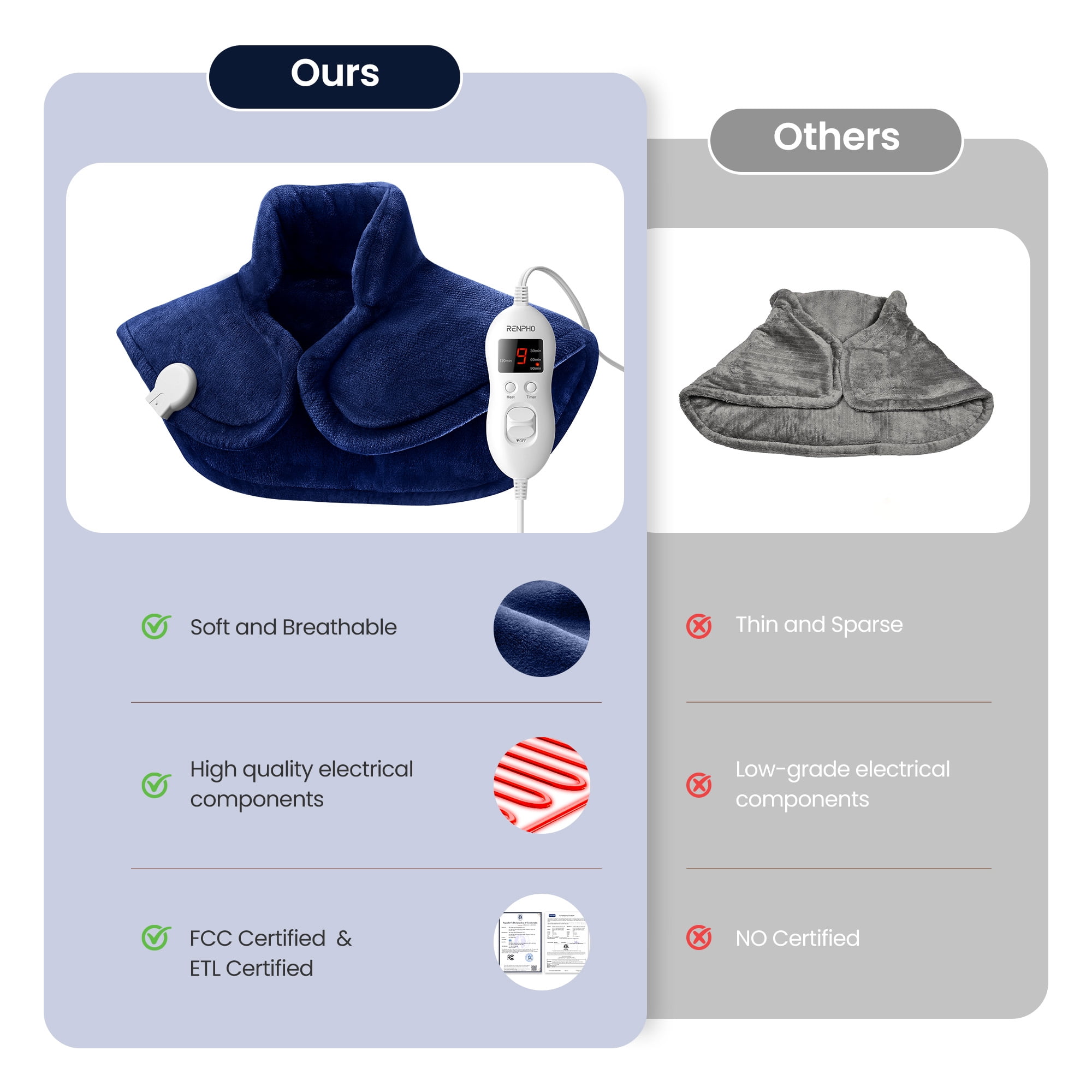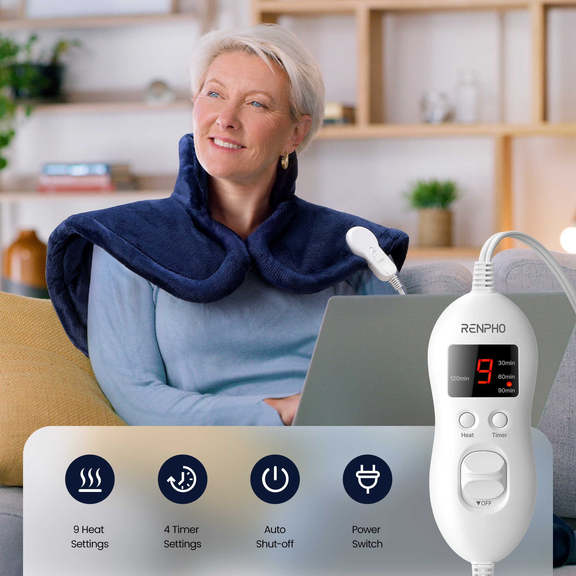 - Great gift for friends, family, and yourself. Color: Blue Size: 19" x 24" Rated Voltage: AC 120V 60Hz Rated Power: 90W Power Cord Length: 7 feet Material: Flannel 4 Timers: 30min/60min/90min/120min Heating Pad x 1 Power Cord with Controller x 1 User Manual x 1 Renpho empowers people worldwide to improve their health and well-being. We focus on designing and building an ecosystem of smart health, wellness, and fitness products and solutions that are affordable and accessible for everyone. It is due to our strong belief in providing only the highest standards that we became the No.1 best-seller of Smart Body Scales worldwide from 2018-2022, with a growing community of over 14 million users internationally.