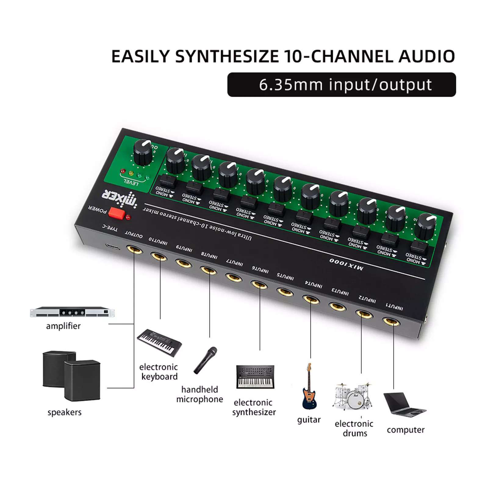 Multichannel audio processing capability: This 10-channel stereo mixer supports 10 6.35mm TRS/TS inputs, allowing 10 sets of audio signals to be entered simultaneously. Each group of circuits operates independently, ensuring that each channel does not interfere with each other, avoiding crosstalk phenomenon, and providing a solid foundation for professional audio processing.