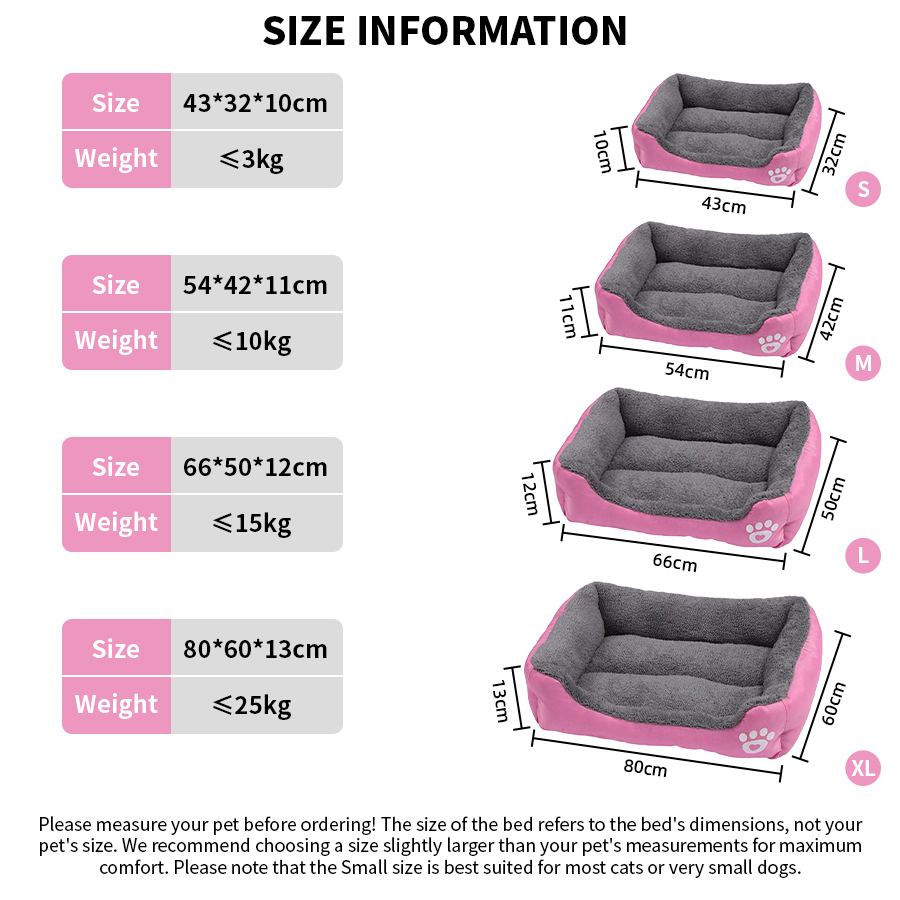 Please measure your pet before ordering! The size of the bed refers to the bed's dimensions, not your pet's size. We recommend choosing a size slightly larger than your pet's measurements for maximum comfort. Please note that the Small size is best suited for most cats or very small dogs.
