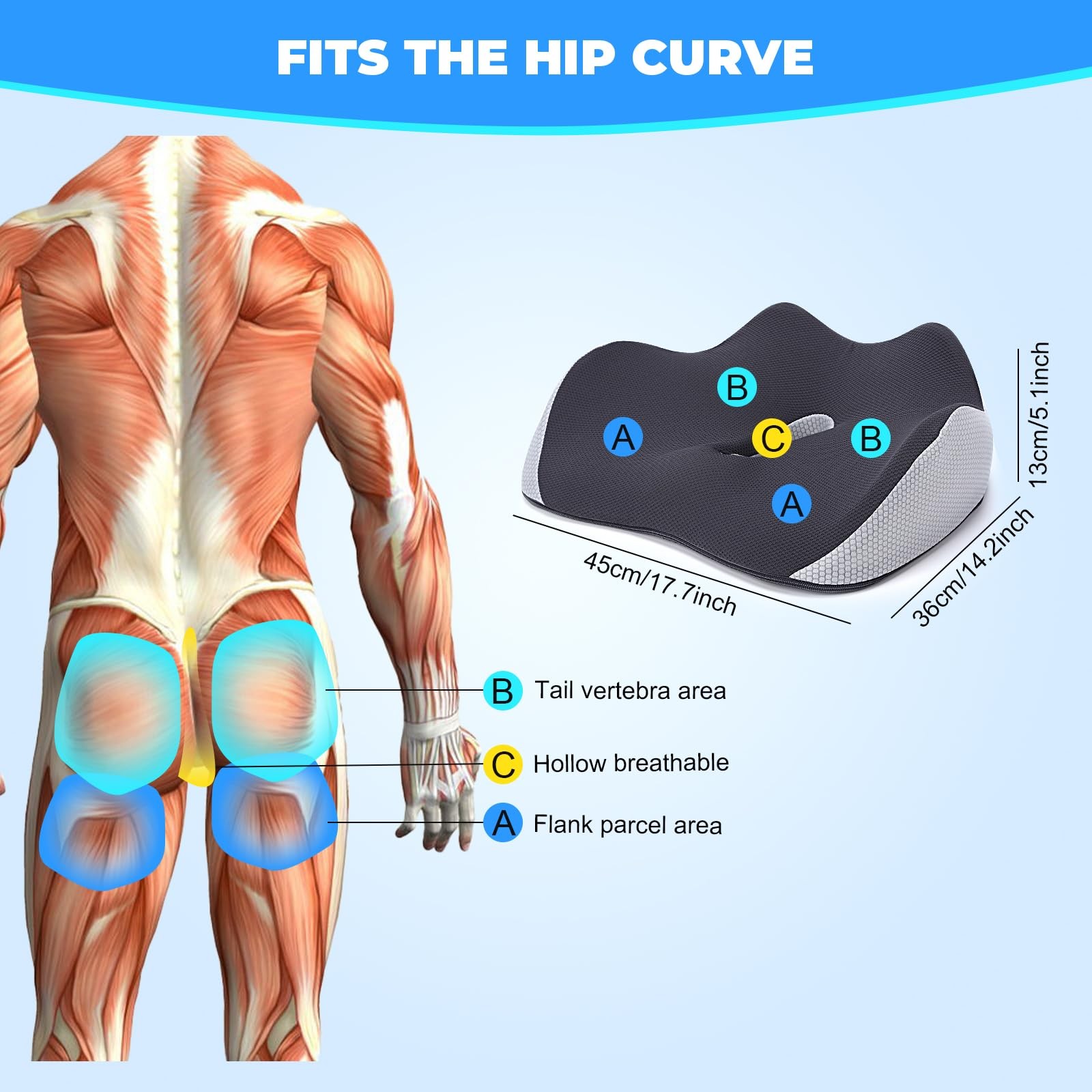 - Die Größe beträgt 45 x 36 x 13 cm, was breit genug ist, um Ihr Gewicht effektiv zu verteilen und den Körperdruck abzubauen.