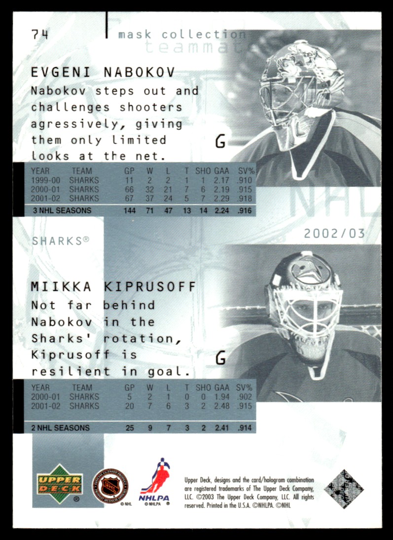 | 2002-03 Upper Deck Mask Collection Miikka Kiprusoff/Evgeni Nabokov San Jose |