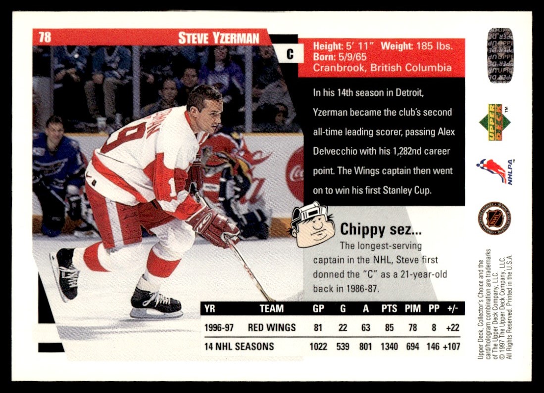 | Description: | Steve Yzerman | | Category: | Hockey | | Year: | 1997 | | Product: | Collector's Choice | | Team: | Detroit Red Wings | | Card Number: | 78 | | Dimensions: | 3½" x 2½" | | SKU: | HK HK0025 R02 K (76) |